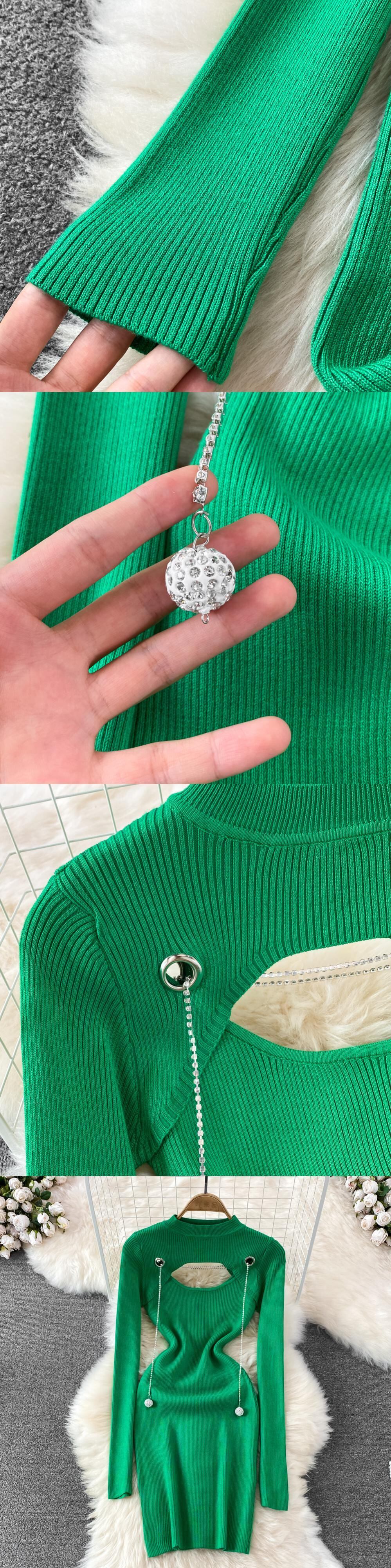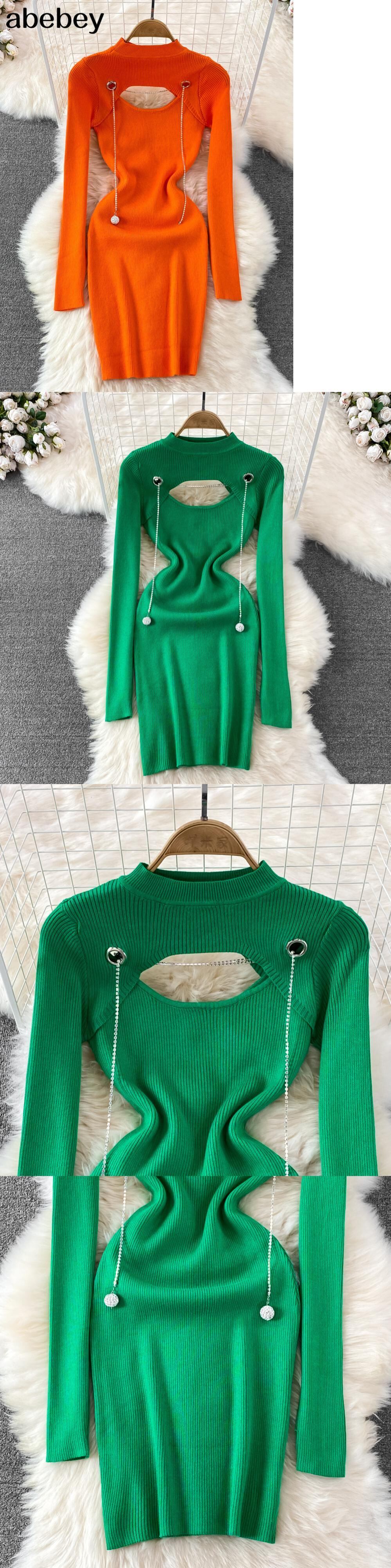 中空アウト秋の女性ニットドレス長袖弾性ウエスト暖かいドレス冬ボディコンミニセータードレス ロング エラスティック 伸縮 オータム 秋物 ウィンター 冬物 Abe31512919589