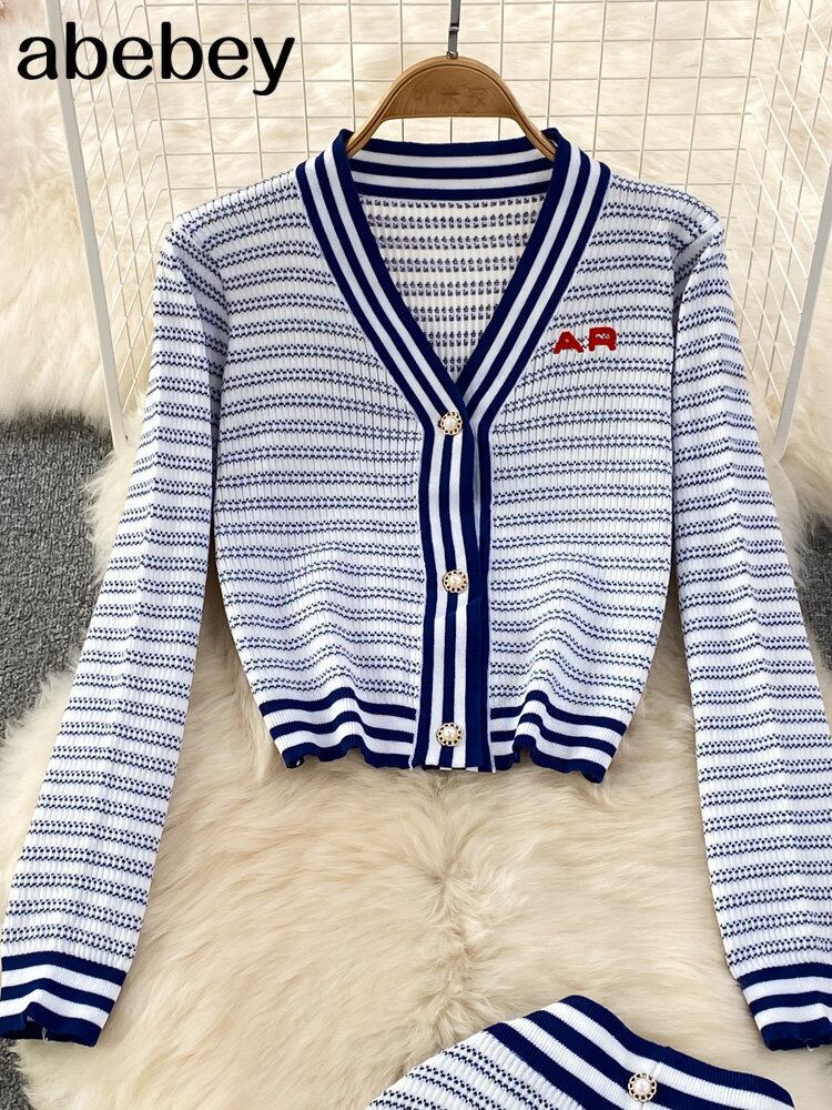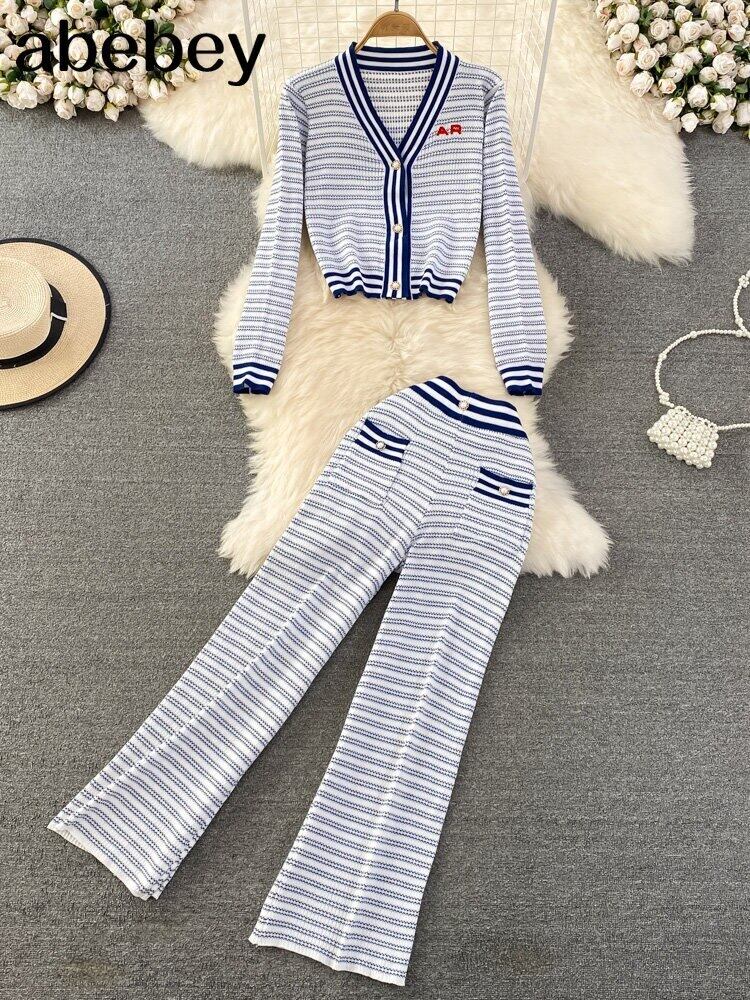 ストライプ 2 個セーター セット女性トラック スーツ V ネック セーター + ルーズ パンツ シックなプルオーバー セーター + ニット キャロット パンツ セット Vネック Abe98250268981