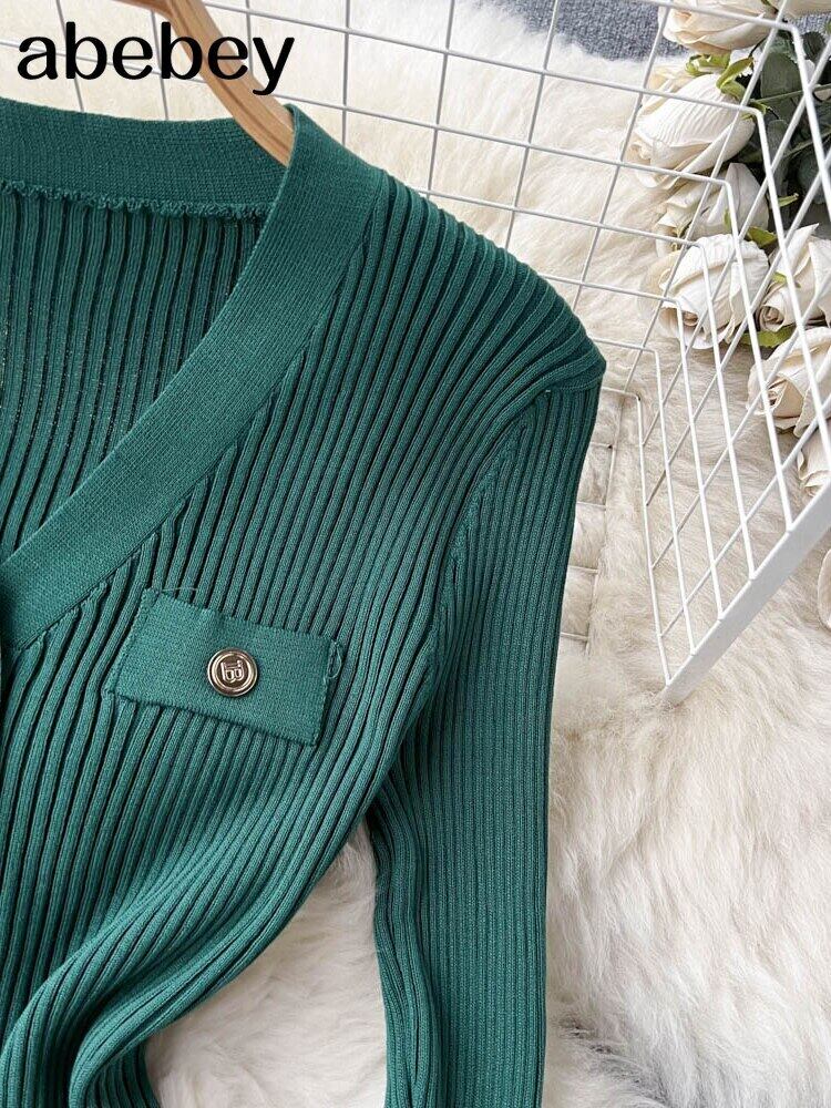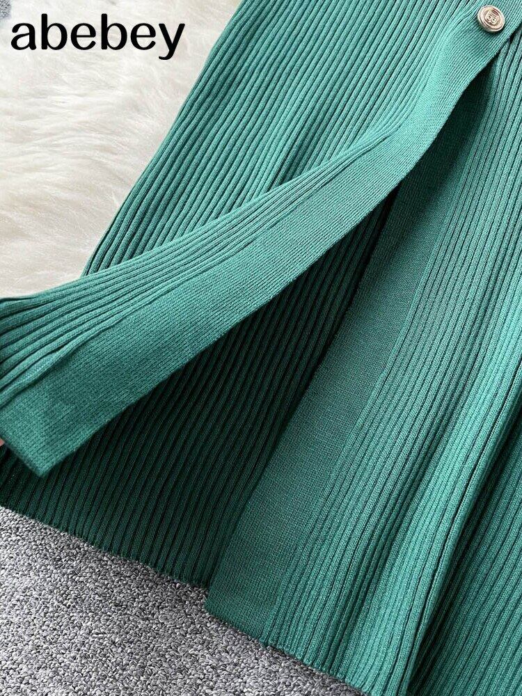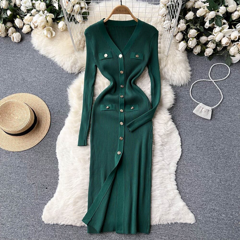 グリーン女性ニットドレス長袖 V ネック弾性スリムペンシルドレス 2022 秋のセクシーなボディコンスプリットセータードレス ロング エラスティック 伸縮 オータム 秋物 Vネック Abe88536263005
