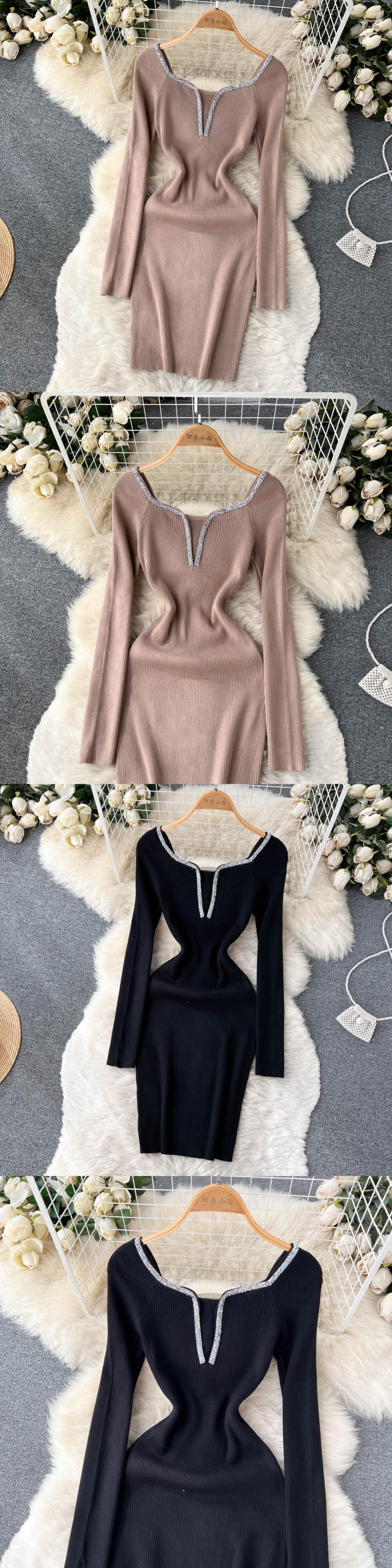 レトロスリムボディコンニットドレス気質長袖ボディコンセータードレススクエアカラーの女性の冬のショートドレス ロング ウィンター 冬物 スクウェア Abe92552219754