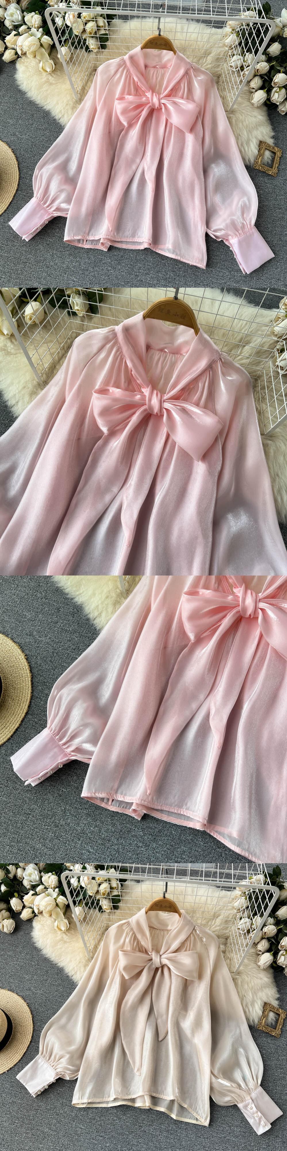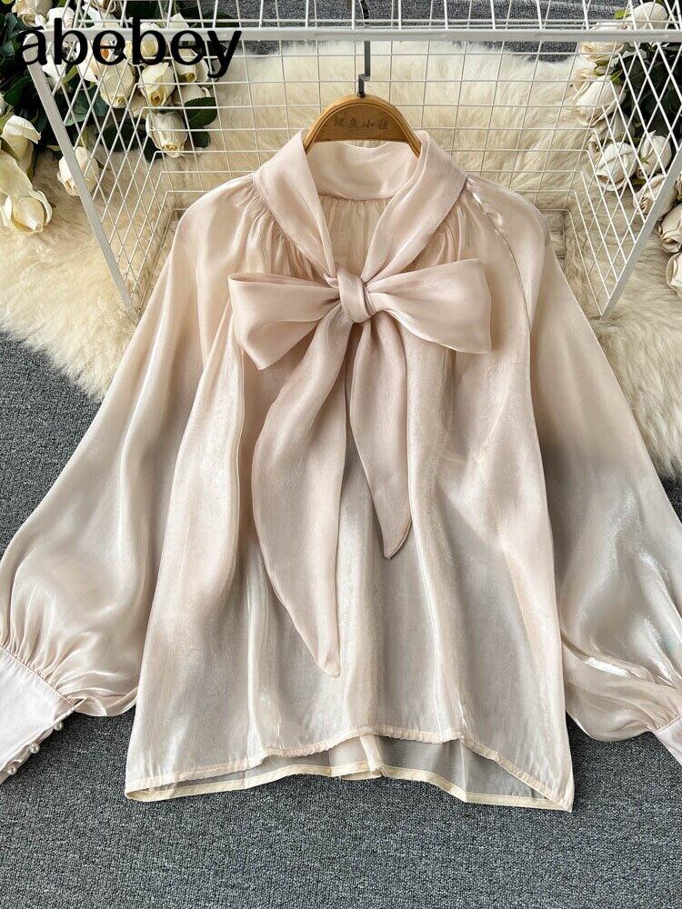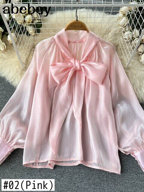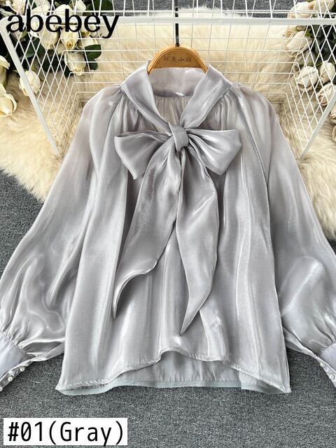 気質トップス女 リボン ブラウス オータム 秋物 Vネック ソリッドカラー Abe35934259940