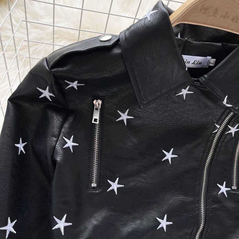 女性レトロ花柄刺繍フェイクソフトレザージャケットコートターンダウン襟 Pu モトバイカーブラックパンクアウター ファー Abe83162962366