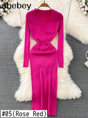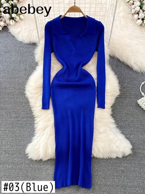 女性ニットドレス長袖 V ネック弾性スリムペンシルドレス 2022 秋のセクシーなボディコンセータードレス ロング エラスティック 伸縮 オータム 秋物 Vネック Abe29193708207