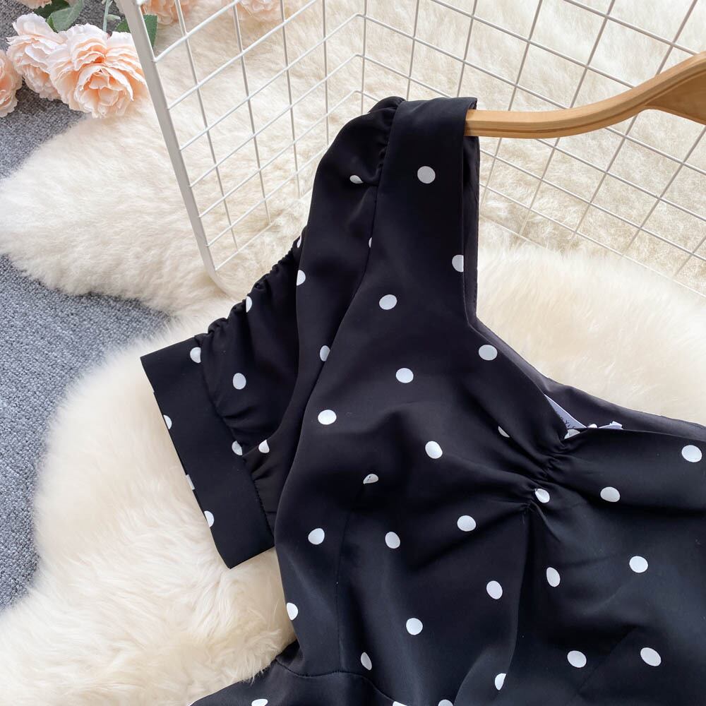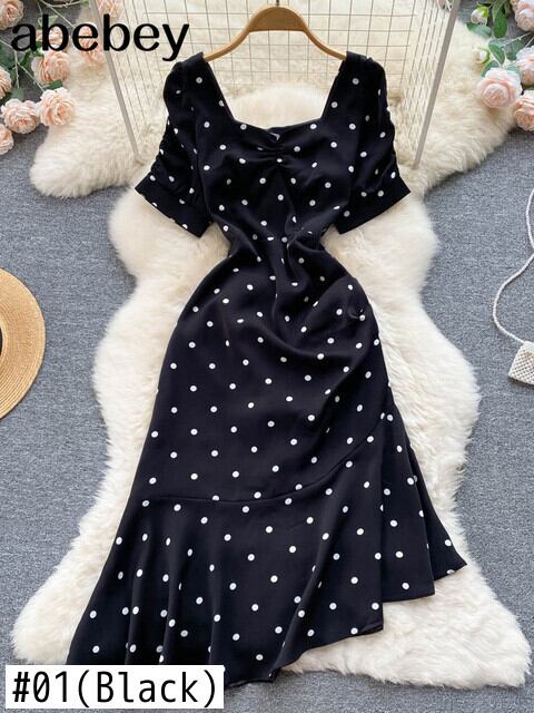 スクエアカラーポルカドットドレス女性ショートパフスリーブ甘い女の子の 2022 不規則な Vestidos 大人ガーリー スウィート キュート カジュアル スクウェア Abe82935555360