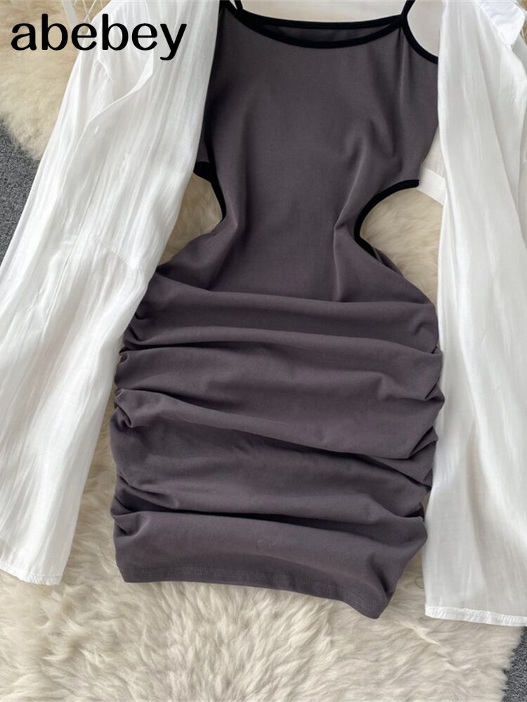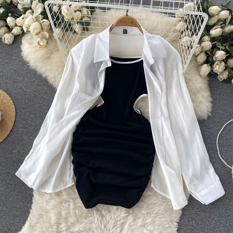 女性 2 点セット長袖白シャツ トップ + ボディコン スリム ウエストシャーリング スパゲッティ ストラップ ドレス ロング ホワイト Abe89845933664