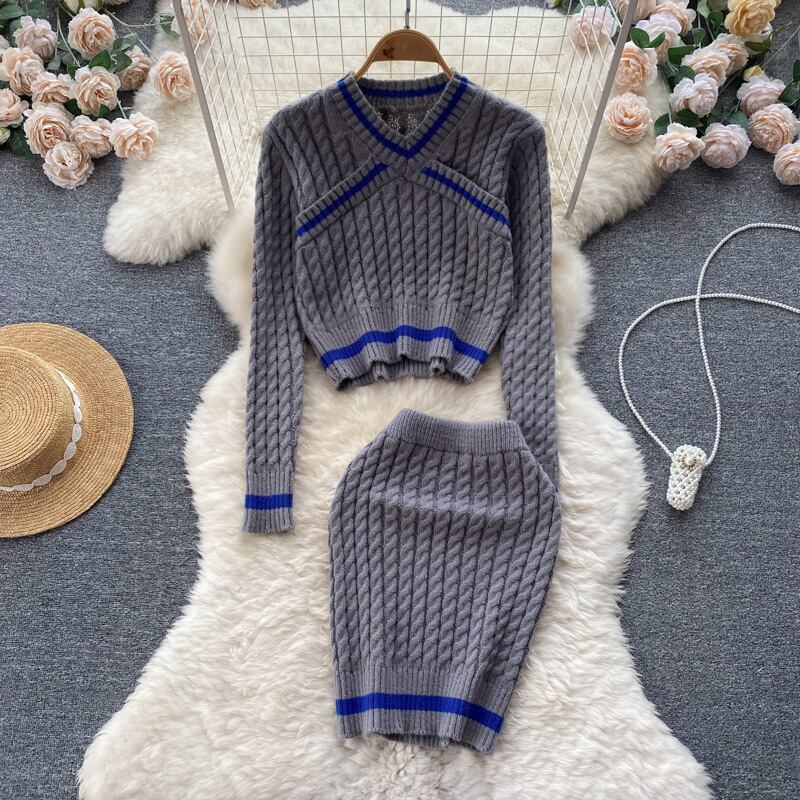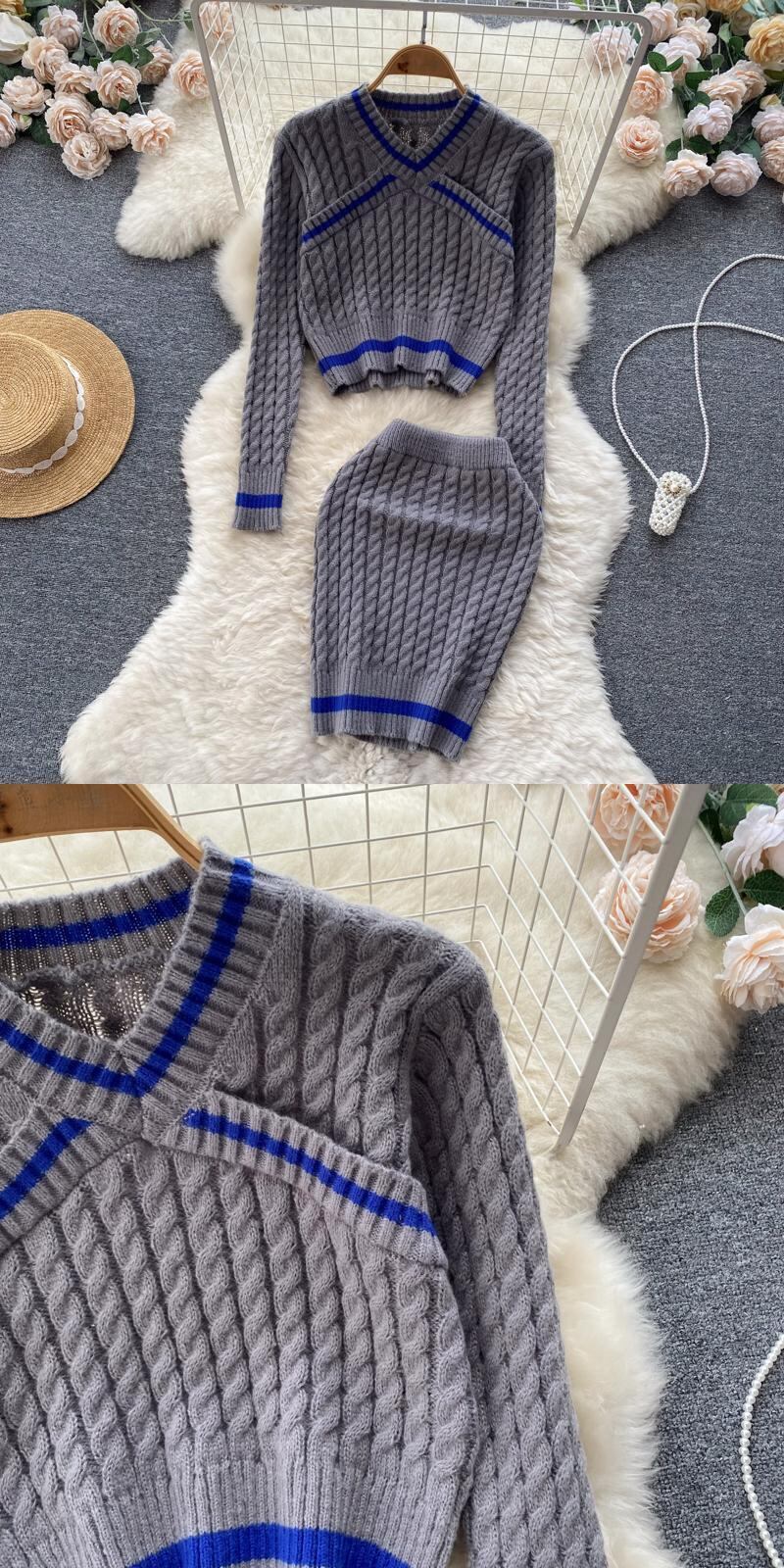 V ネックニットプルオーバートップとショートスカート 2 点セット女性スリムフィットセーター女性秋のセーター衣装女性 オータム 秋物 Abe82874885221
