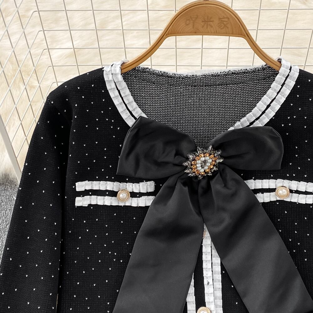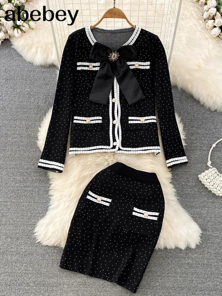 2022 秋冬カラー黒ニットスーツ女性の O ネックカーディガンセーター + ウエストミニスカート 2 点セット ブラック オータム 秋物 ウィンター 冬物 Oネック Abe46125365156