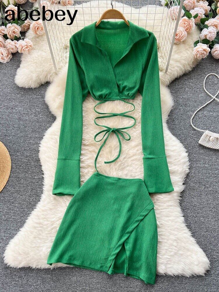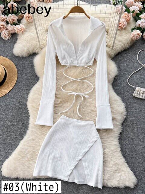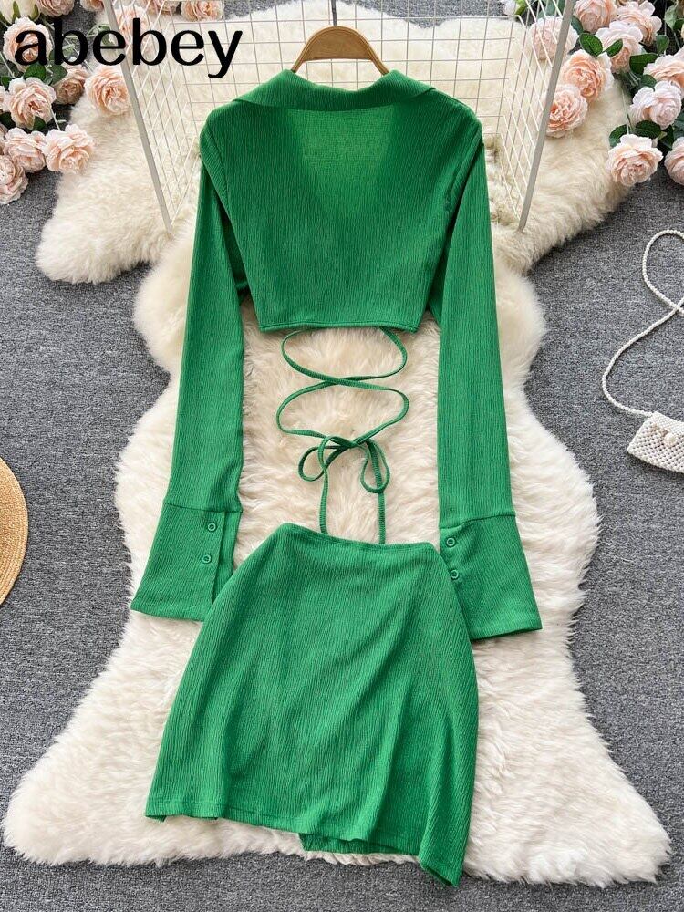 2 ツーピースセット衣装長袖包帯クロップトップスリットミニスカートスーツ 2022 秋の女性のセクシーなパーティークラブカットアウトスカートセット ロング オータム 秋物 Abe38398399045
