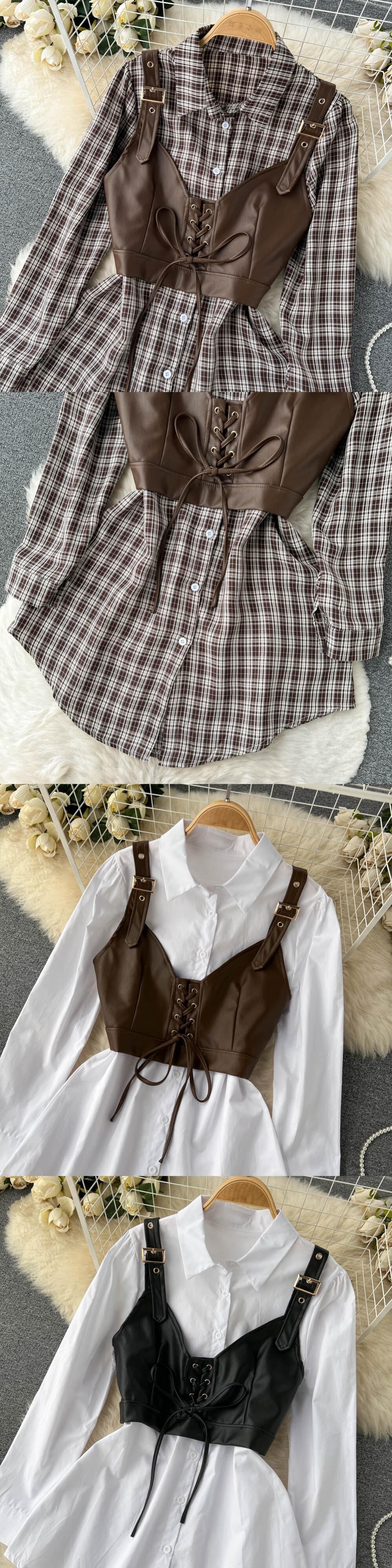2022 秋ドレス二枚スーツ長袖白シャツドレス + ミニ PU 包帯キャミソールスーツ女性ストリートスリムセット ロング ホワイト オータム 秋物 Abe54609442652