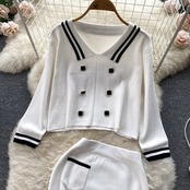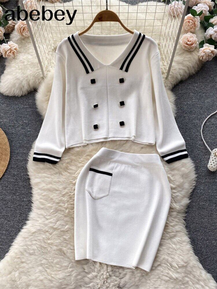 ホワイトニットプルオーバートップとショートスカート 2 点セット女性スリムフィットセーター女性秋のセーターの衣装の女性 オータム 秋物 Abe73235093740