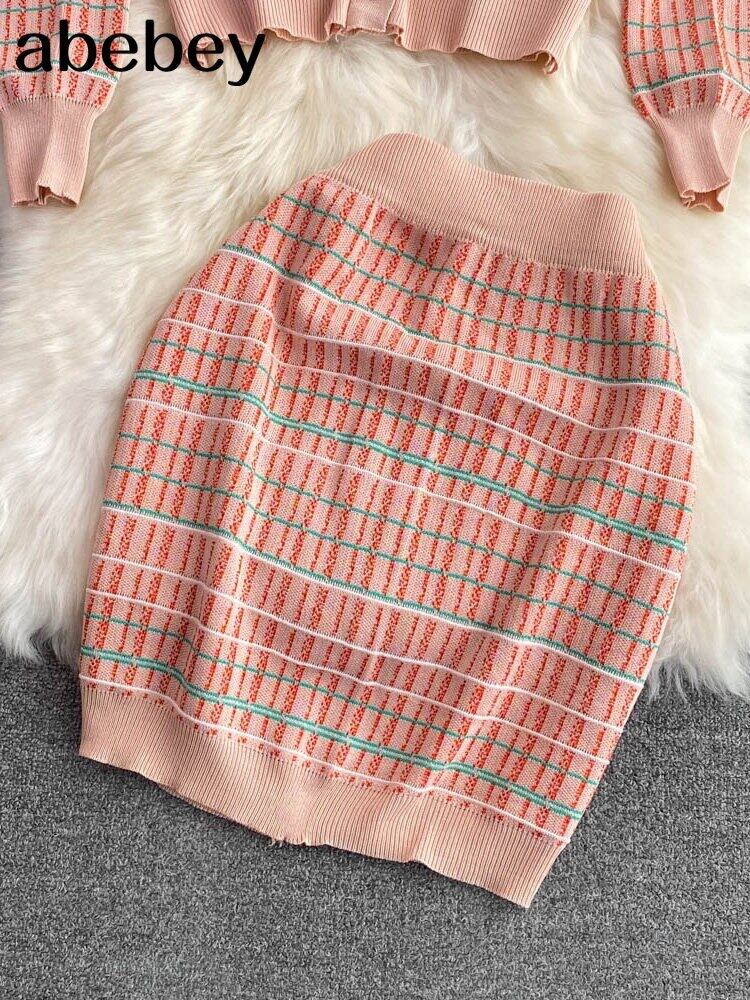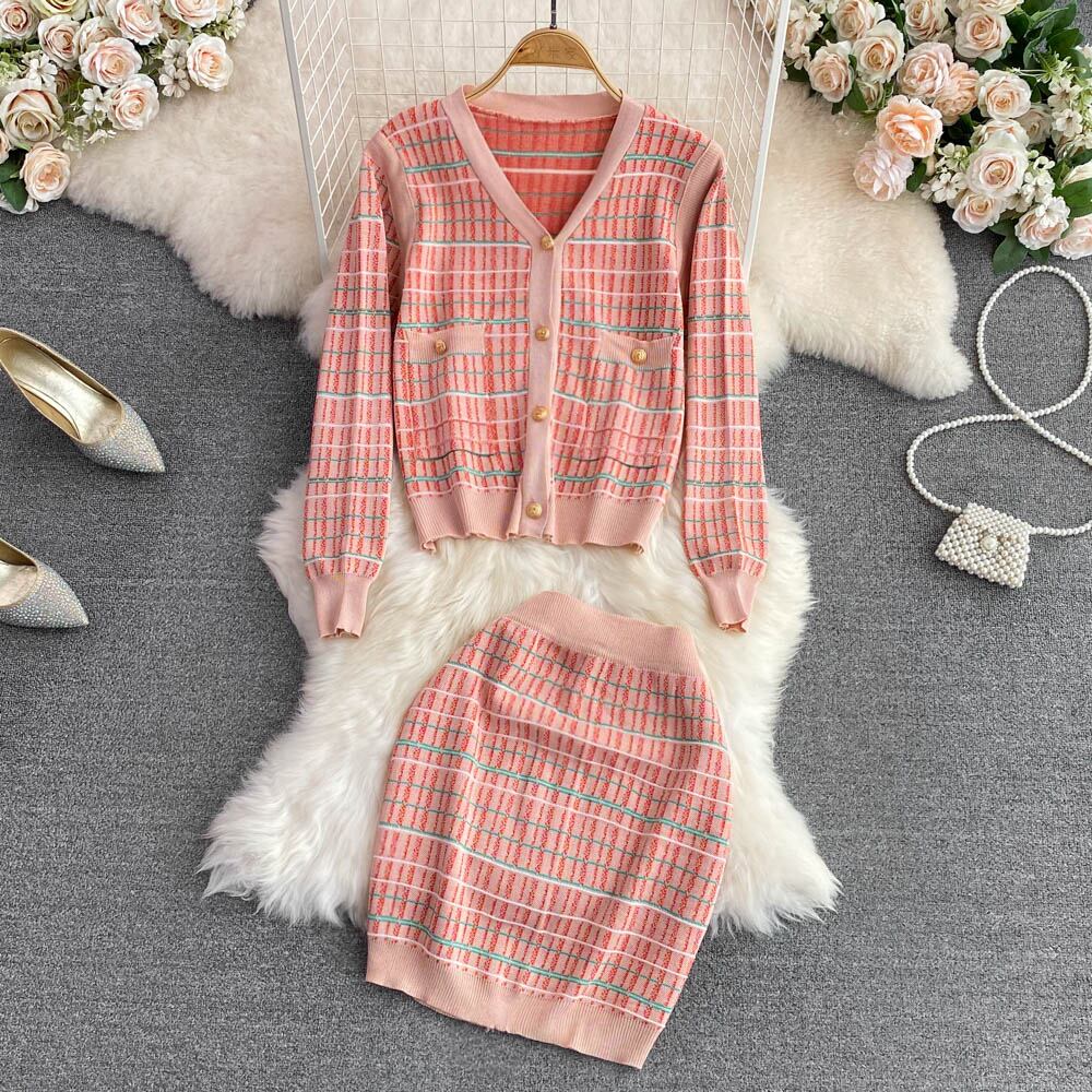 ピンク秋冬女性セットセーター緩いチェック柄ニットカーディガン + スカートセットアンサンブル 2 個 2022 オータム 秋物 ウィンター 冬物 Abe85860143716