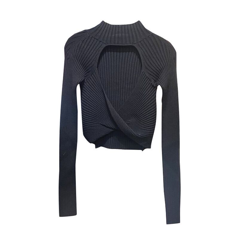 ストライプ背中の開いたセクシーなショートトップス女性タートルネック長袖スリム Tシャツ 2022 秋スタイリッシュ ロング Abe35895974389