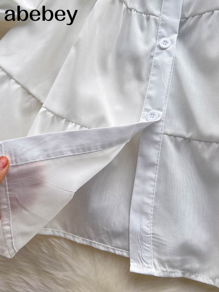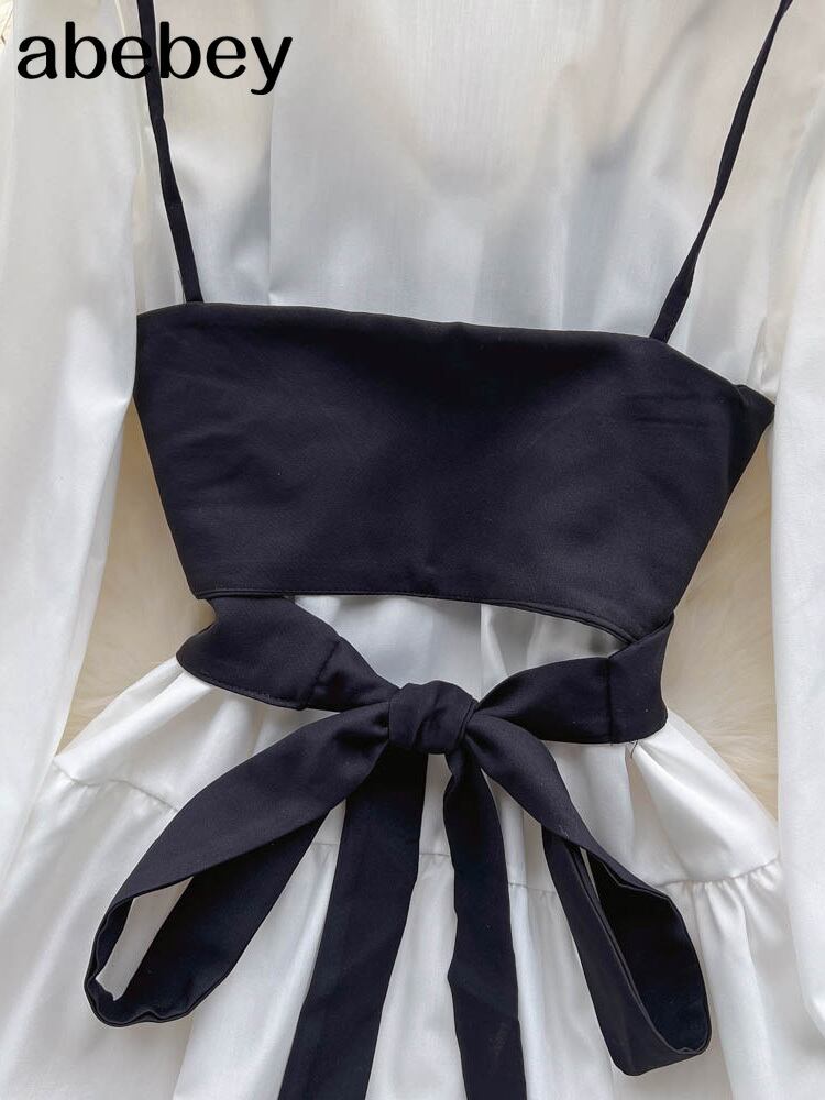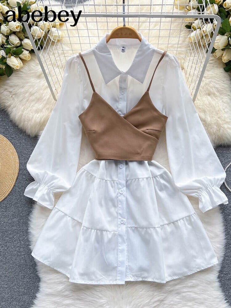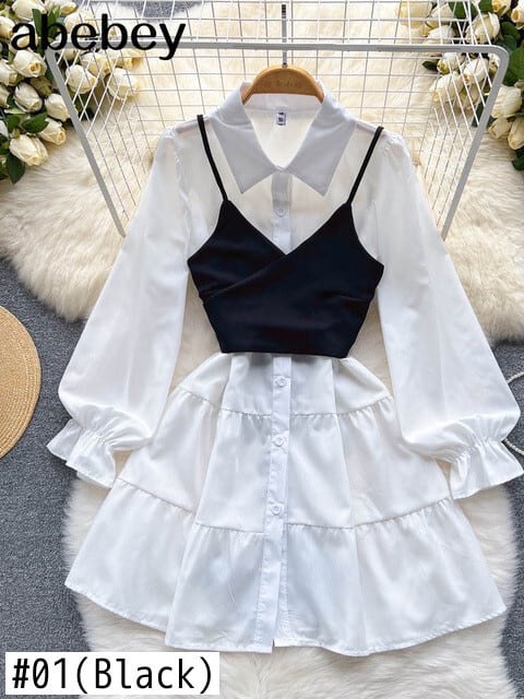 2022 女性の服の衣装無地長袖白の基本的なシャツドレス黒のベスト 2 点セット衣装服 ロング ホワイト ブラック ソリッドカラー Abe45456963045