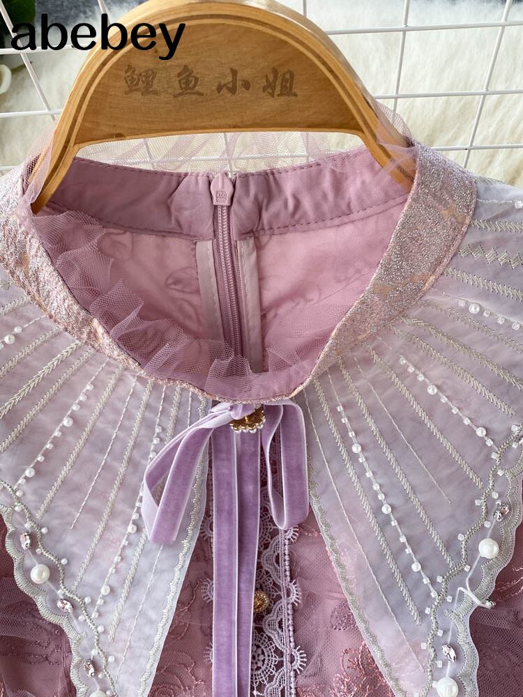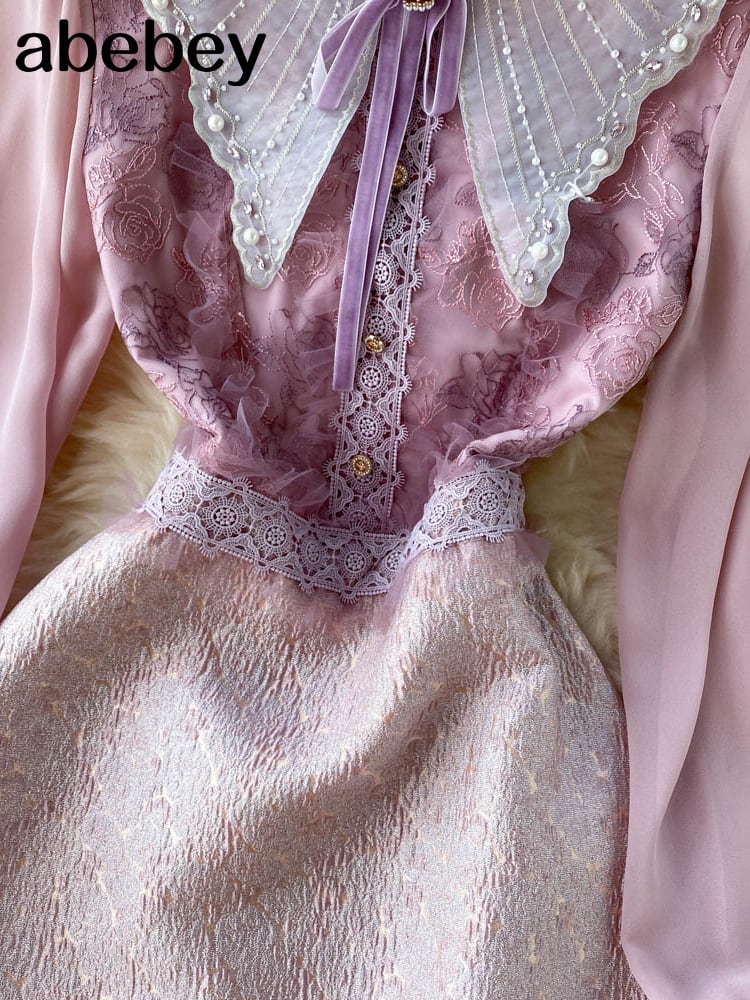 女性ランタン スリーブ スリム ビーズ レース パッチワーク ドレス滑走路フリル ピンク ツイード ドレス Vestidos ランタンスリーブ ラッフル Abe55308159533