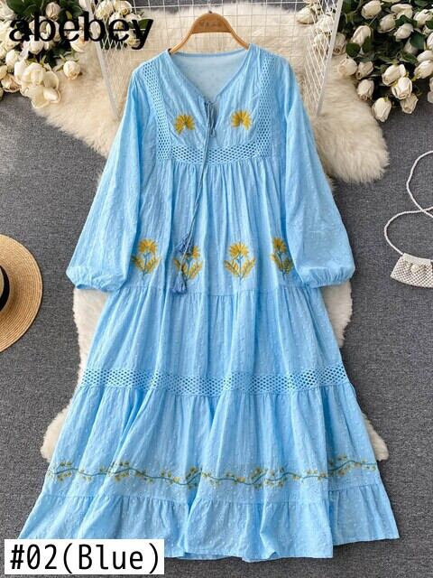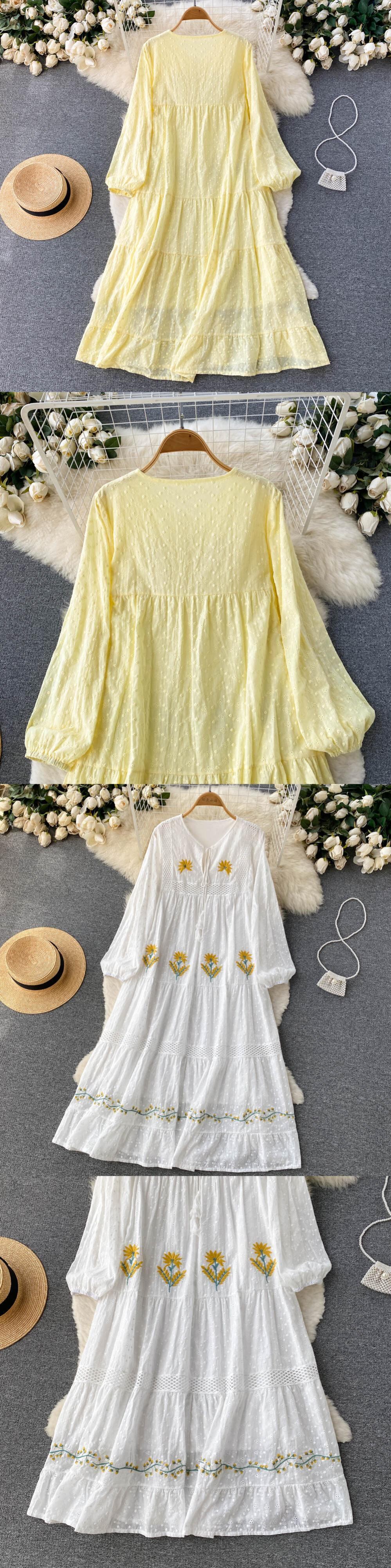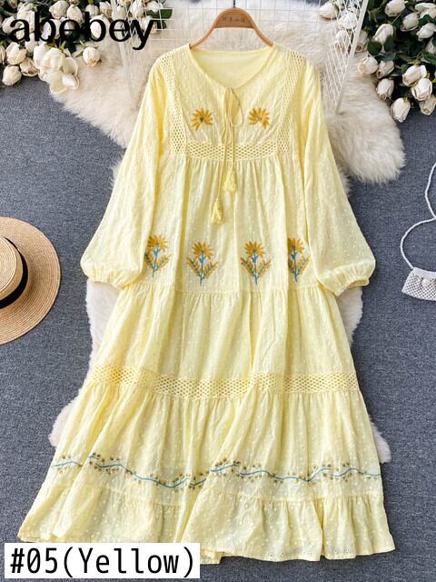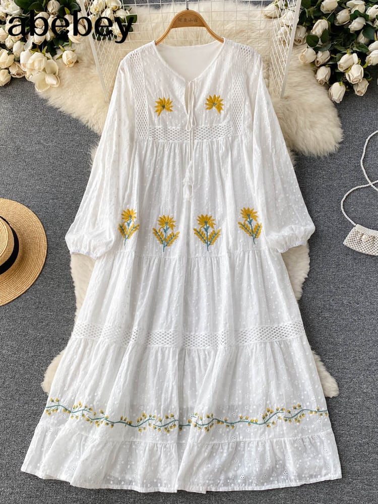 女性の夏のボヘミアンルースミディドレス花刺繍白色 Zaful 自由奔放に生きるストリート Vestidos Elbise Traf ホワイト サマー 夏物 フラワーデザイン Abe17735796768