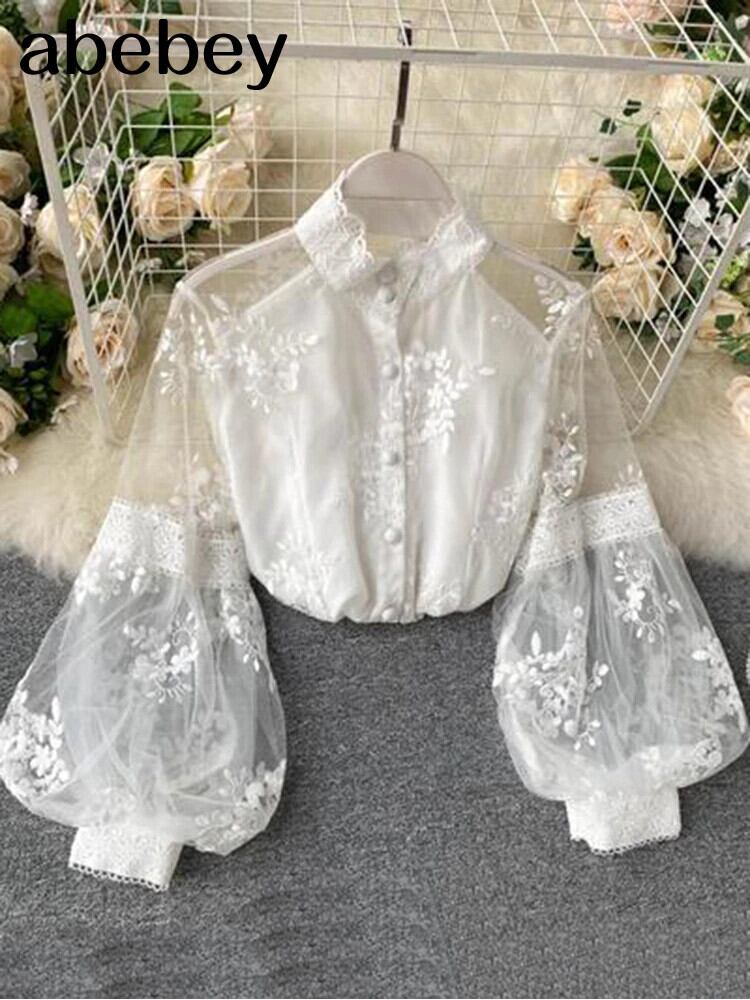 女性のレトロなメッシュレーストップス女性のスタンドカラー 3D 刺繍ロングランタンスリーブコートスリムシャツブラウス P298 レッド Abe46475951820