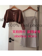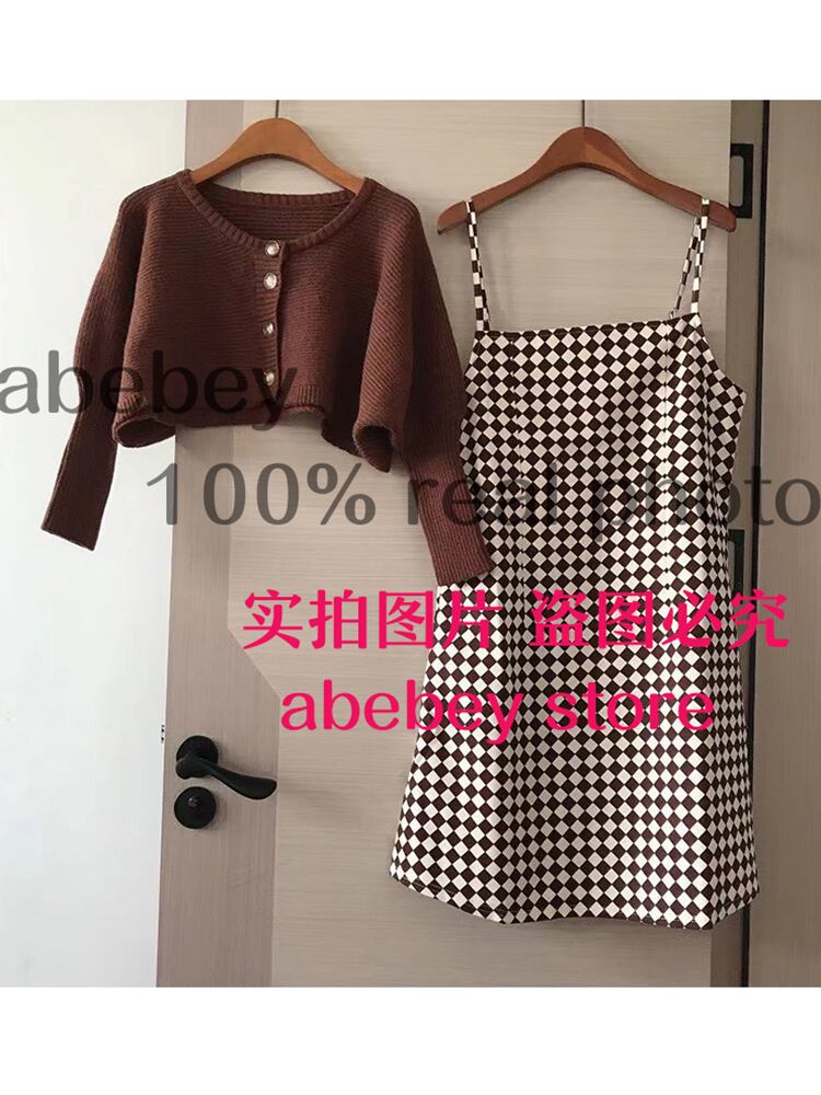 秋冬セット女性長袖ショートニットカーディガン + ノースリーブチェック柄ストラップドレスツーピーススーツ ロング オータム 秋物 ウィンター 冬物 Abe19869678321