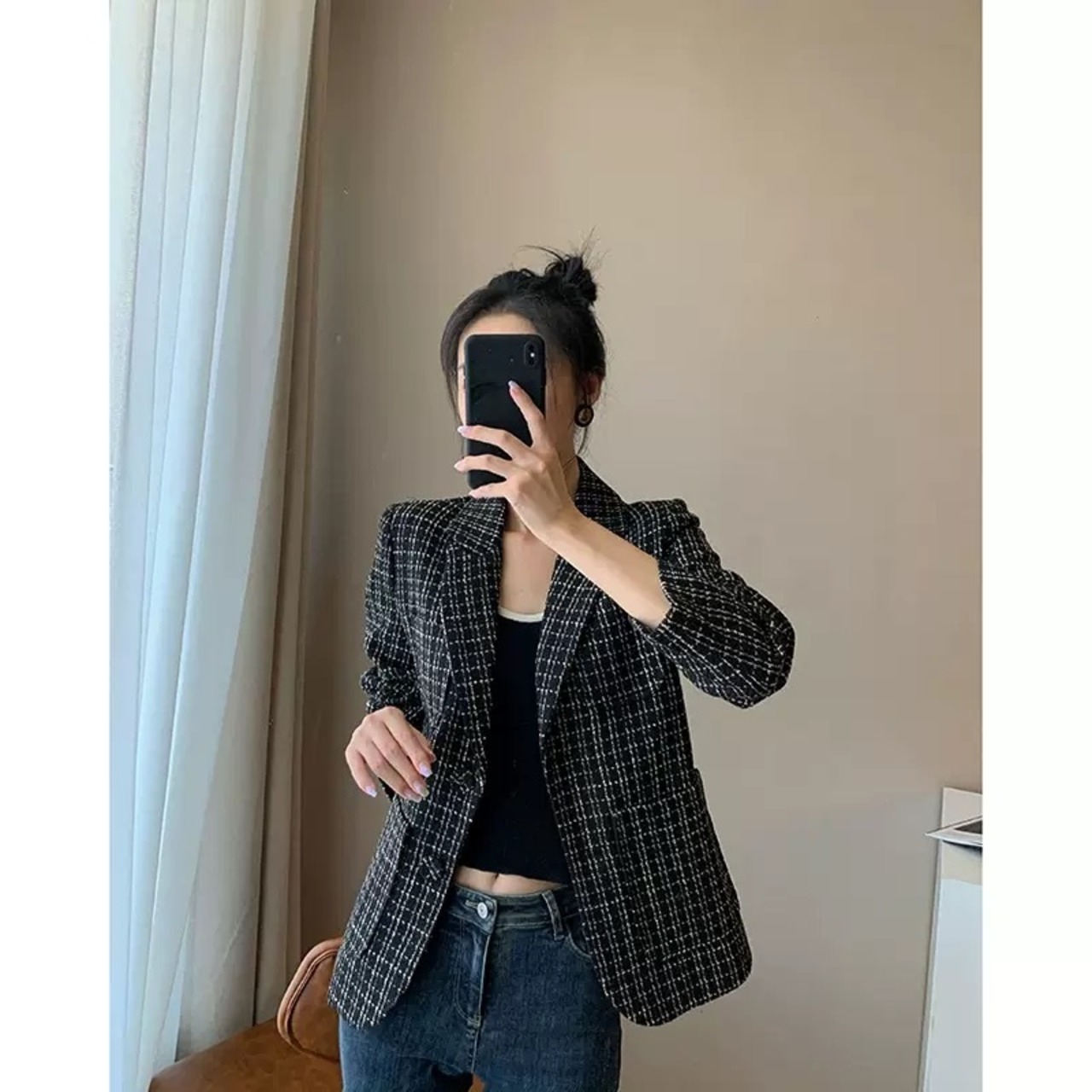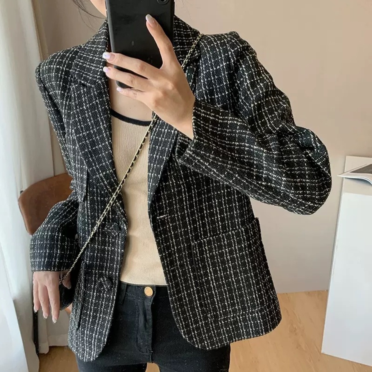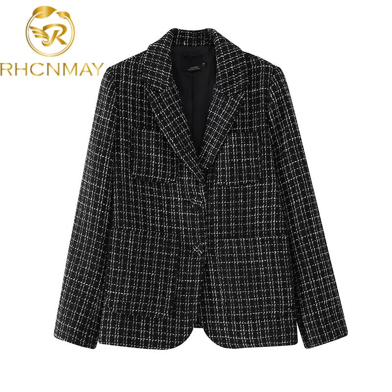 秋冬ツイードチェック柄ブレザージャケット女性ストリートポケットスリムスーツコートオフィスブレザートップ オータム 秋物 ウィンター 冬物 会社 学校 通勤や通学にも Rhc75929280433