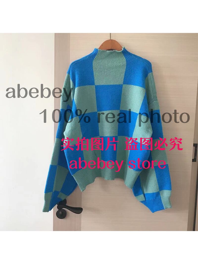 女性 2022 チェック柄特大タートルネックセーターランタン長袖プルオーバーシックなトップス BC92A ロング Abe60748484373
