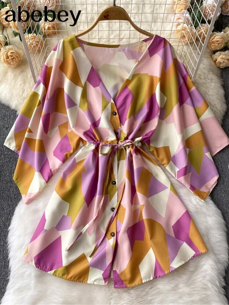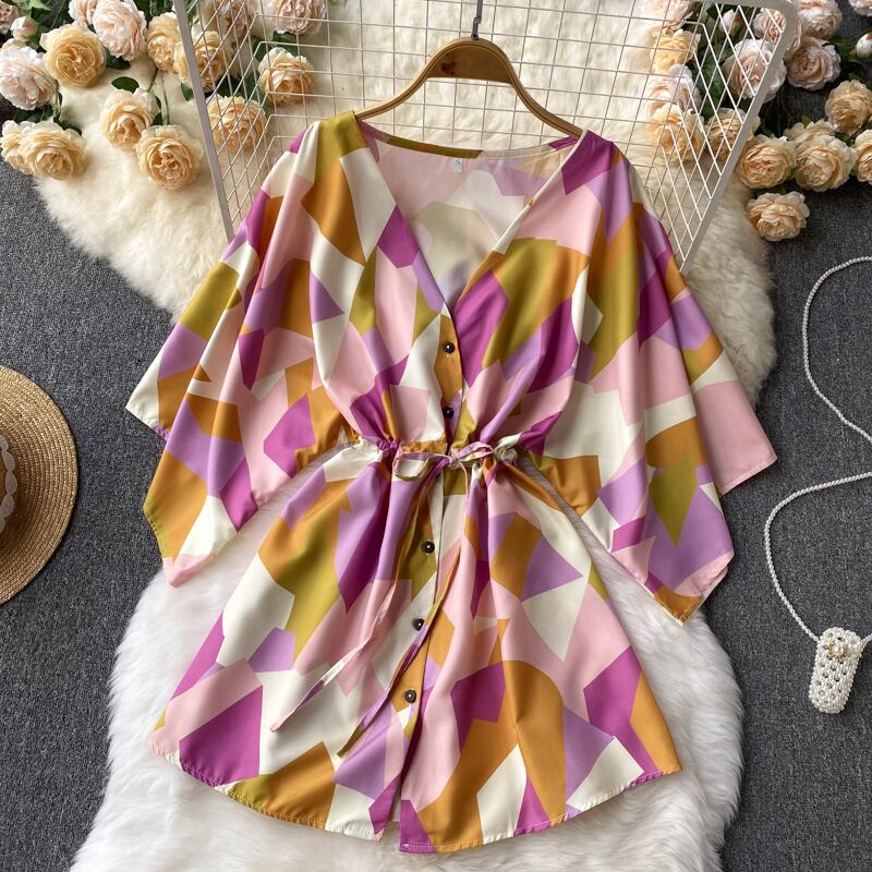 2022 ショートドレス女性半袖 V ネックセクシーなプリントドレス夏プリーツ A ラインミニドレス ハーフスリーブ サマー 夏物 Vネック Aライン Abe43797836797