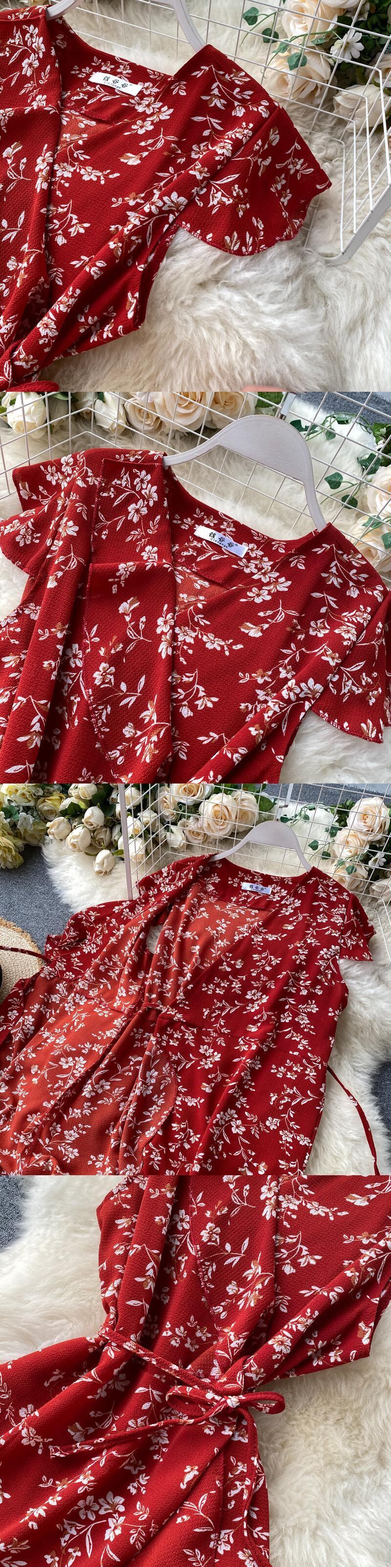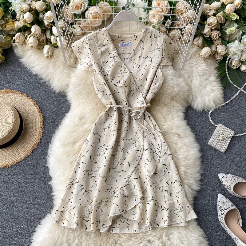女性フローラルサマーラップドレスVネックAラインフリルシフォンショートドレスボヘミアンプリントビーチサンドレス ラッフル 夏物 花柄 Abe97031180519