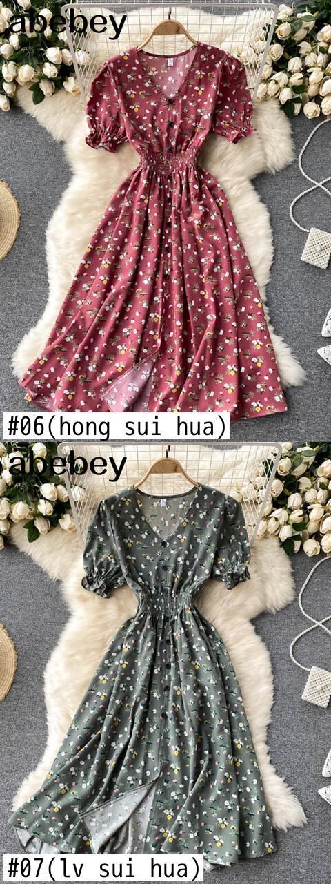 ボタン花柄 V ネック ロング ドレス夏パーティー弾性ウエスト ドレス女性エレガントなチュニック スプリット ビーチ ドレス エラスティック 伸縮 サマー 夏物 Vネック Abe10021296663