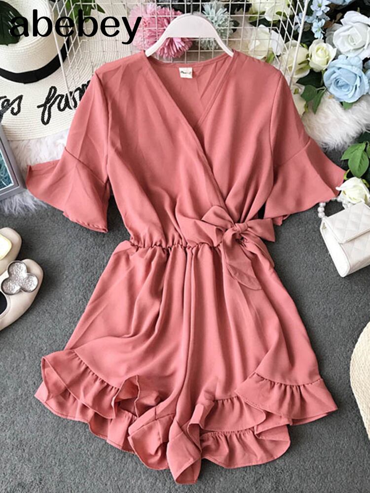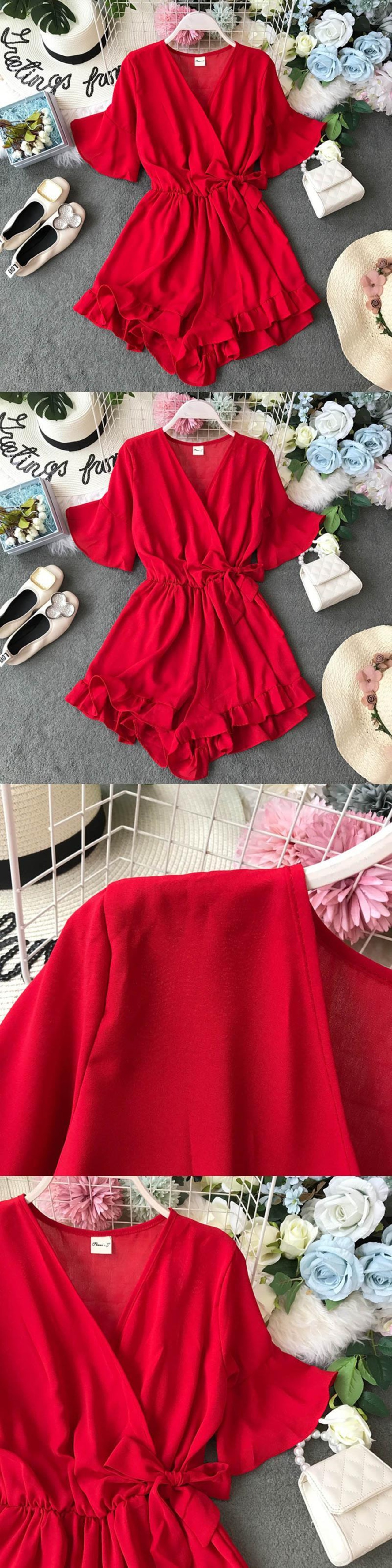 甘いフリル女性遊び着弾性ウエスト弓ジャンプスーツロンパースバタフライスリーブショートオーバーオール女の子 リボン エラスティック 伸縮 大人ガーリー スウィート キュート カジュアル Abe89257986770