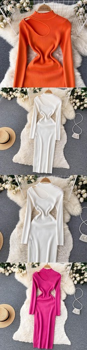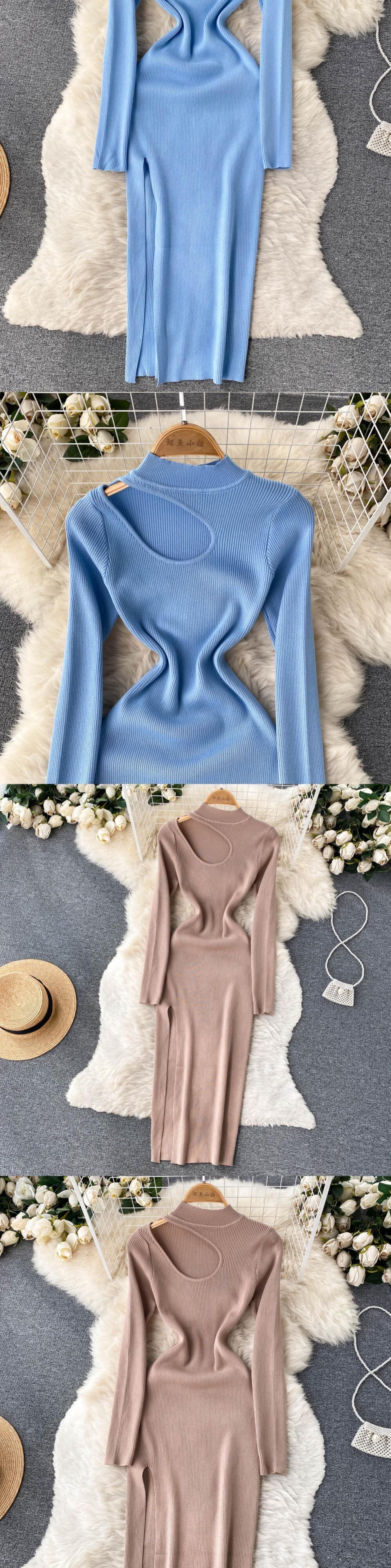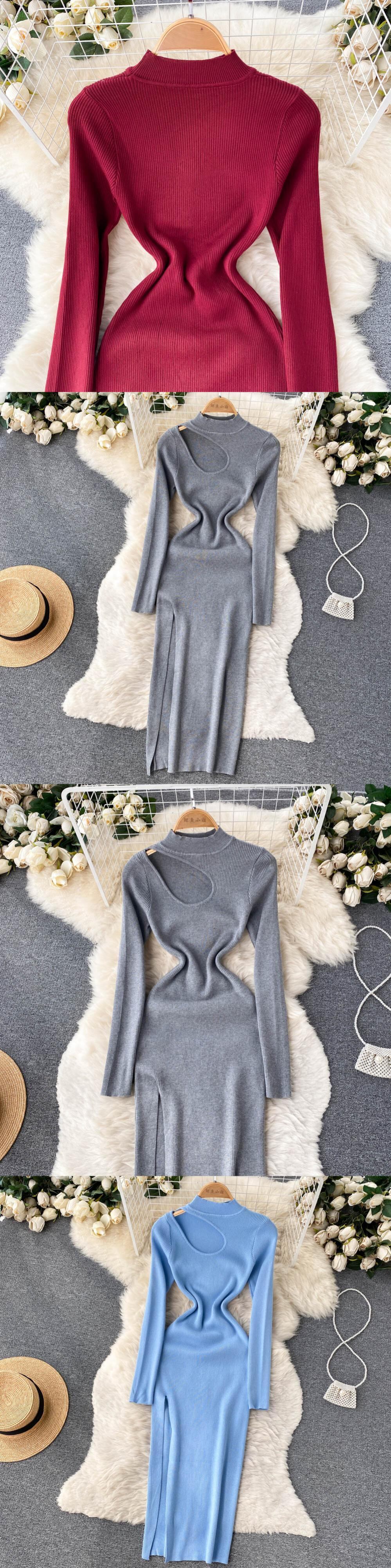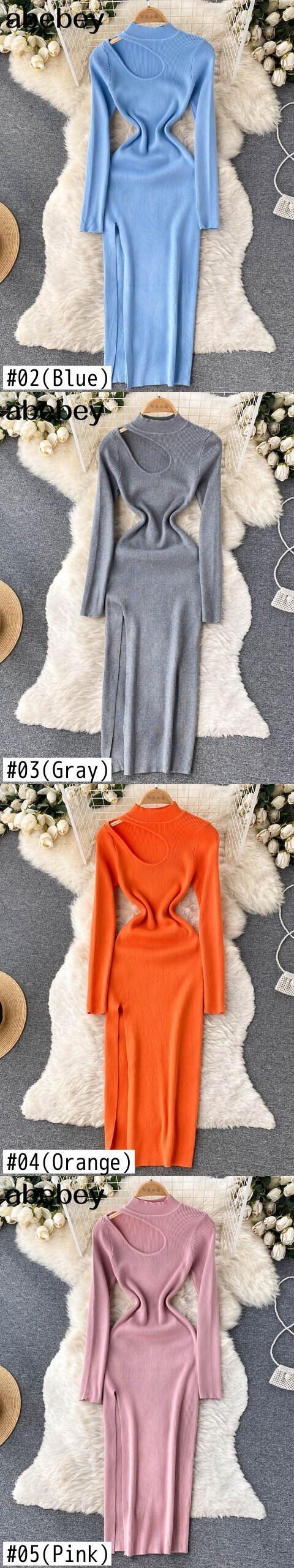 秋シニアニットドレス女性長袖弾性ウエストスプリットセータードレスパーティーセクシーな暖かいボディコンマキシロングドレス エラスティック 伸縮 オータム 秋物 Abe46947634180