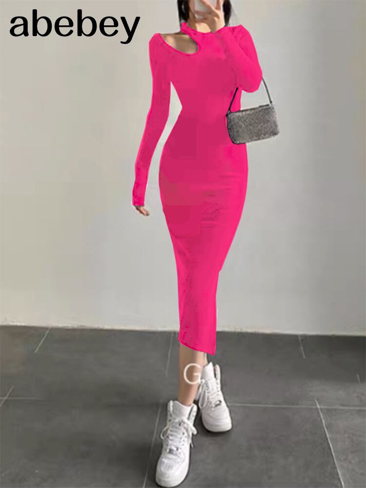 長袖黒ニットドレス秋冬タイトなカットアウトセクシーなスリットミディドレス 2000s ロングマキシレディースドレス 2022 ブラック オータム 秋物 ウィンター 冬物 Abe7578962370