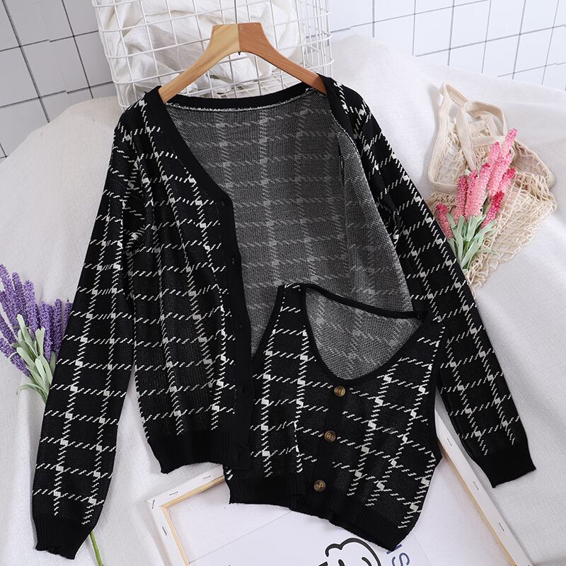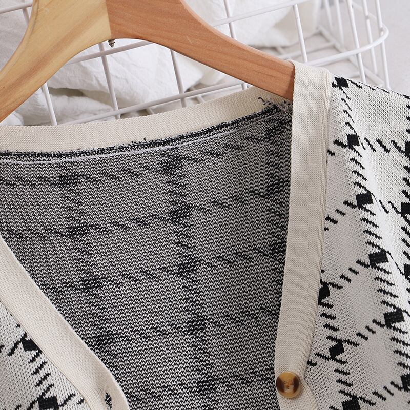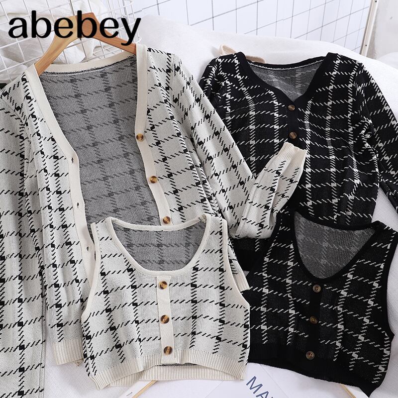 2022チェック柄トップスツーピースVネック長袖ニットカーディガンセータージャンケット+コントラストカラーショートベスト ロング Abe92003405344