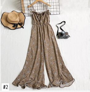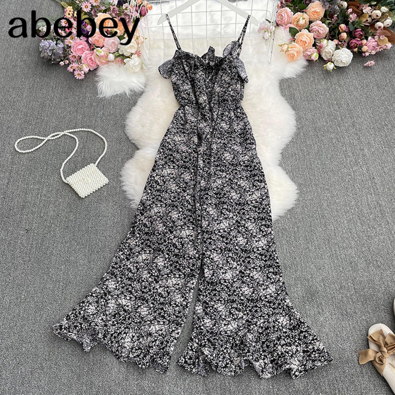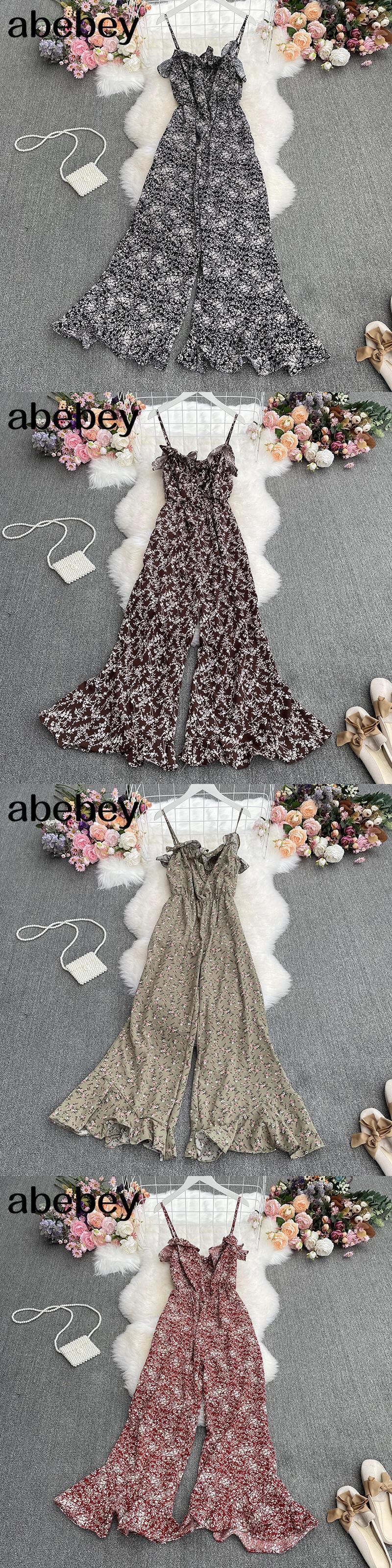 女性花柄ストラップジャンプスーツ夏ノースリーブロンパースセクシーなオフショルダーフリルワイド脚ロングロンパース ラッフル サマー 夏物 ワイドレッグ ワイドパンツ Abe40655633972