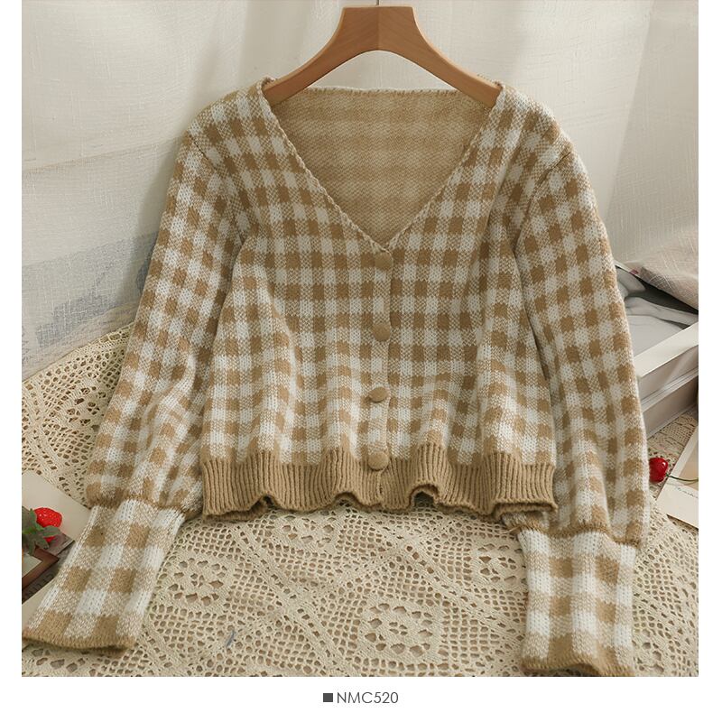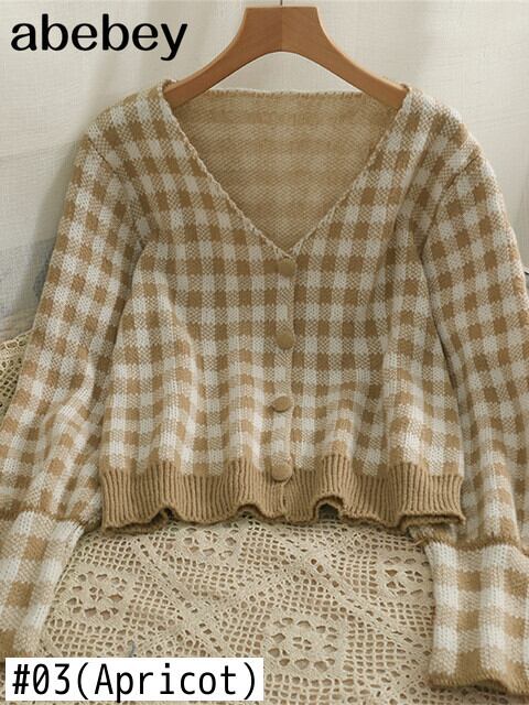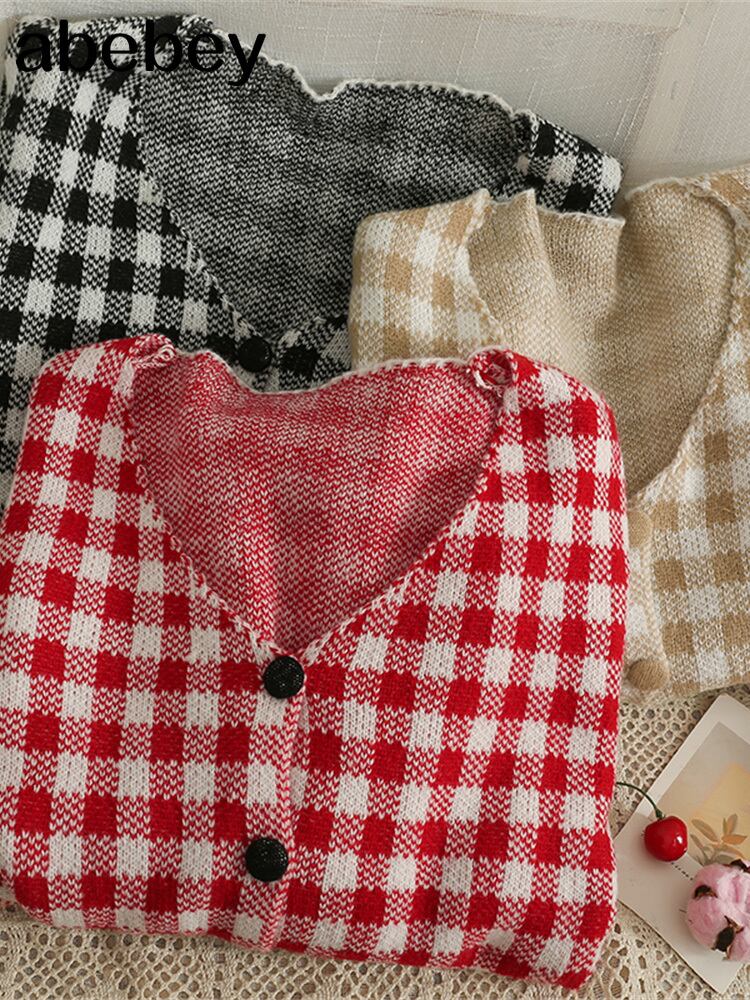 V ネックチェック柄長袖女性セーター 2022 秋冬ショートニットカーディガンセーターレディースイングランドスタイルトップス ロング オータム 秋物 ウィンター 冬物 Vネック ヨーロピアン Abe11482332463