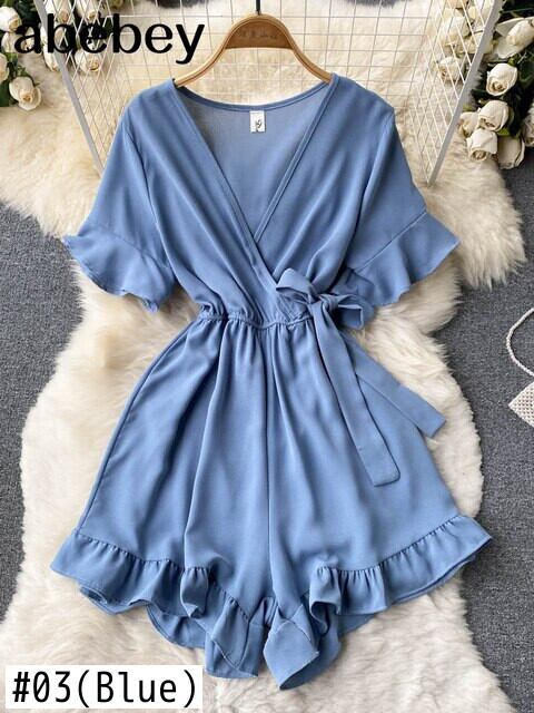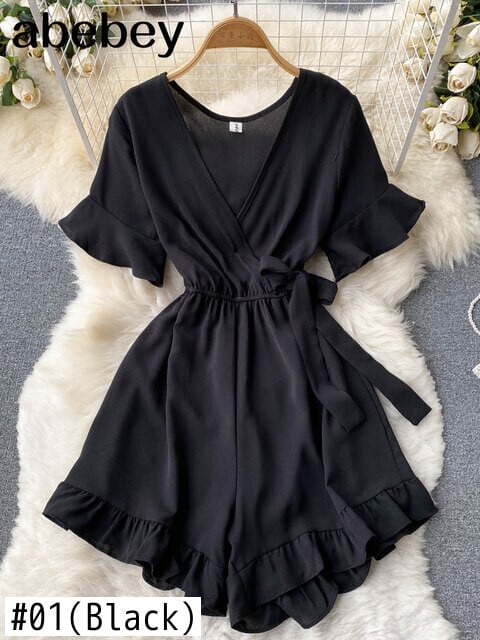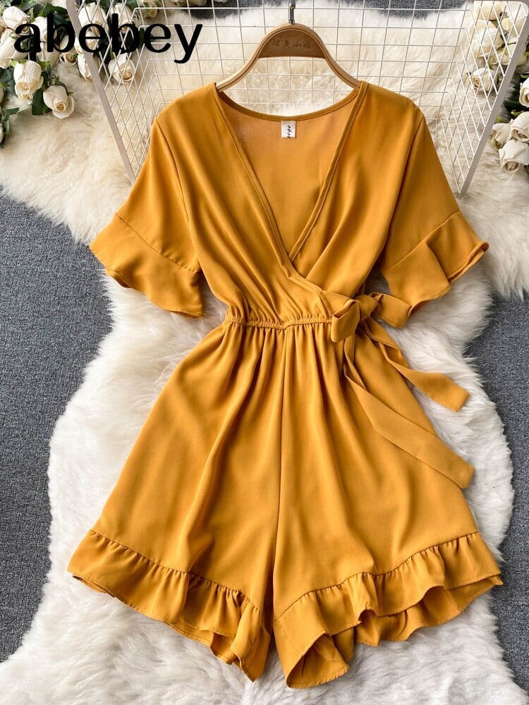 2022 夏ロンパース女性フレアスリーブ固体フリルワイド脚ショートジャンプスーツ休暇ビーチロンパース レッド サマー 夏物 ワイドレッグ ワイドパンツ ソリッドカラー Abe67794284869