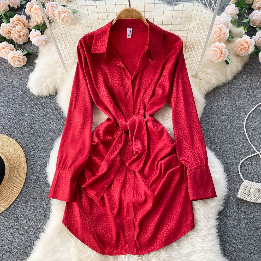 2022 春ドレス女性ターンダウンカラー長袖ソリッド A ラインドレスストリートショートドレス ロング スプリング 春物 Aライン ソリッドカラー Abe29545760504