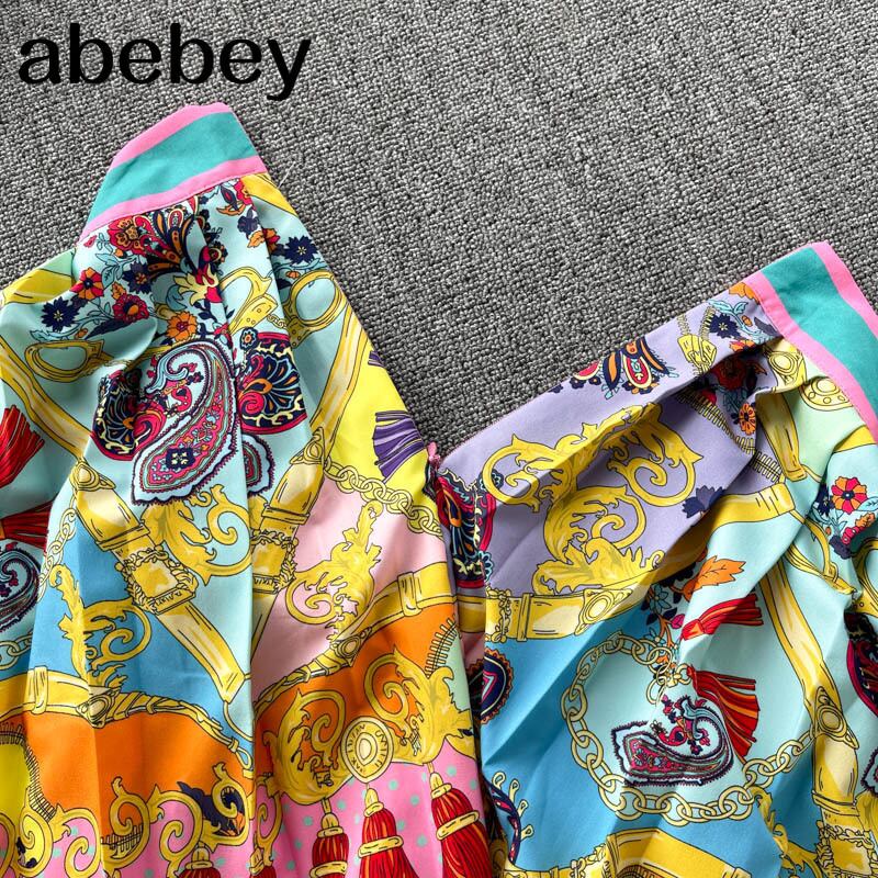 女性の夏のレトロなプリントスーツターンダウン襟ボタン半袖トップ + ウエスト A ラインミディスカート 2 点セット ショート ハーフスリーブ サマー 夏物 Aライン Abe76168809637