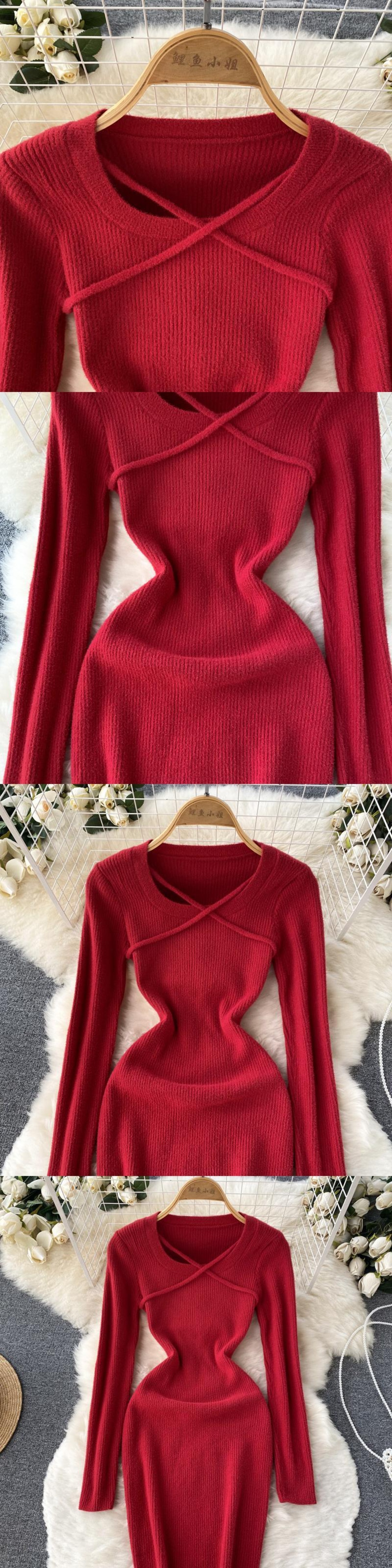 女性ニットペンシルドレス長袖 O ネック弾性スリムドレス秋冬セクシーなボディコン暖かいセータードレス ロング エラスティック 伸縮 オータム 秋物 ウィンター 冬物 Oネック Abe35168691599