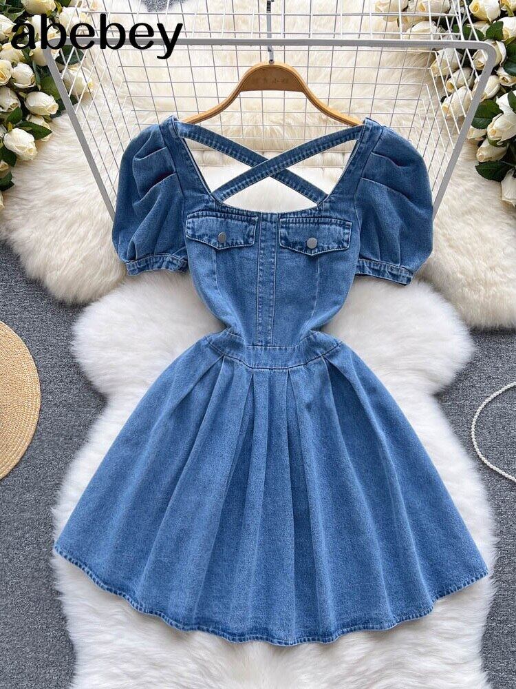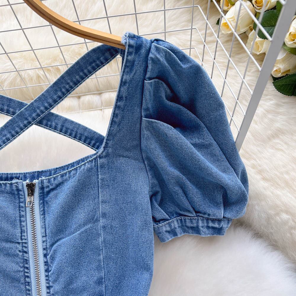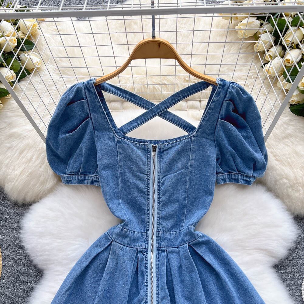 女性の夏のライトブルーデニムミディドレススタイル半袖ラペルポケットスクエアカラージーンズドレス ショート ハーフスリーブ サマー 夏物 スクウェア Abe73609130918