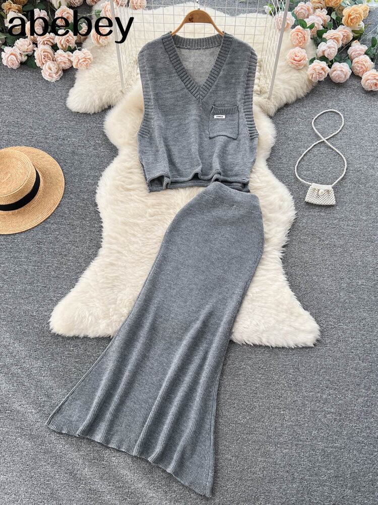 2022 ニットプルオーバーベストとロングスカート 2 点セット女性スリムフィットセーター女性秋のセーター衣装女性 オータム 秋物 Abe54998067156