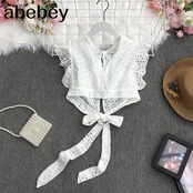 2022 夏セクシーなオールマッチ V ネックノースリーブシャツハイウエストオフへそレースアップ弓中空アウトシャツトップ ハイウェスト リボン サマー 夏物 Vネック Abe30611541504