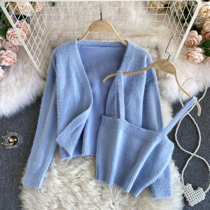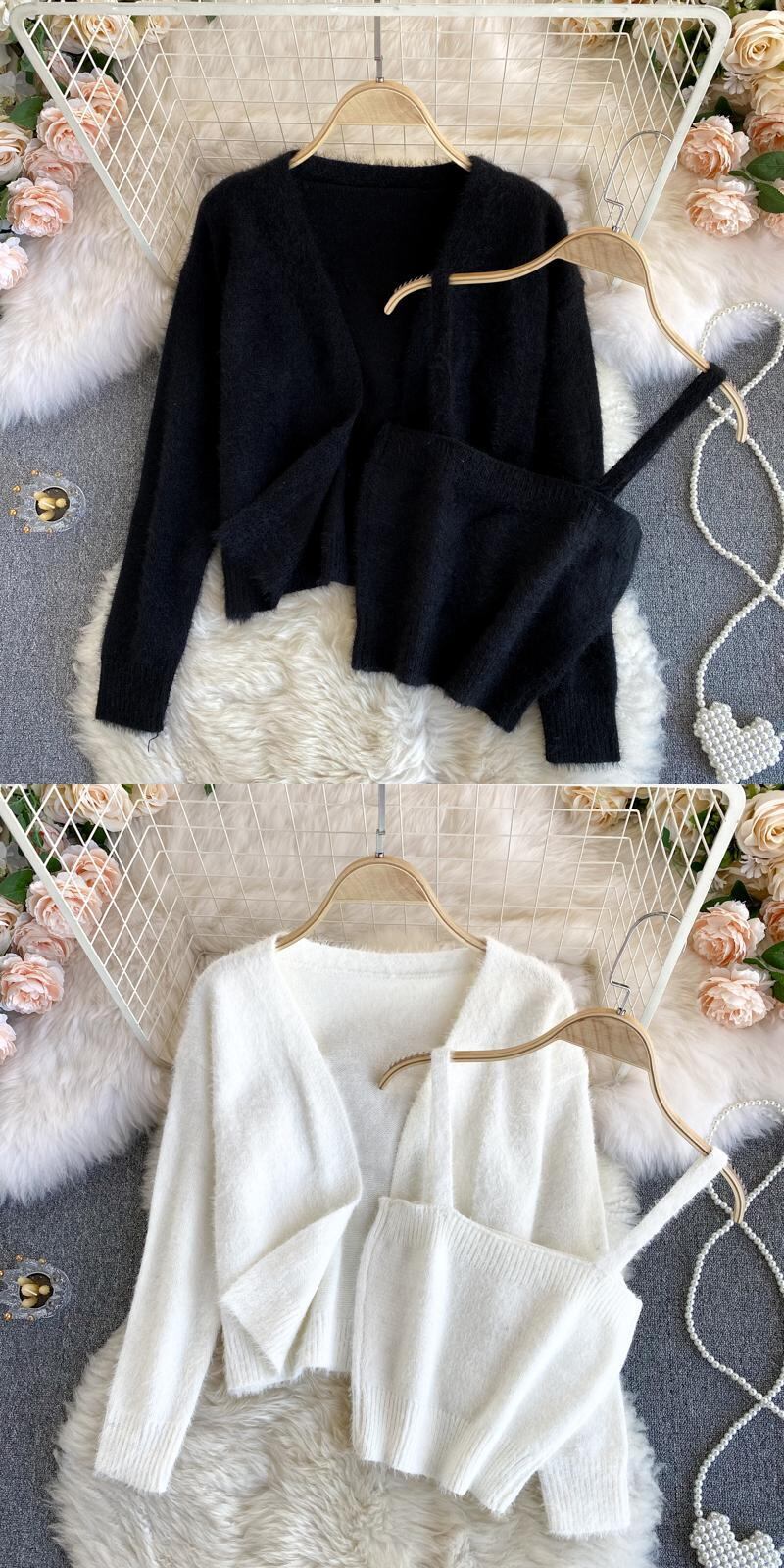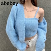 セクシーなニットツーピースセット女性 2022 春秋シックな甘い野生暖かい衣装カーディガン + キャミソール 大人ガーリー スウィート キュート カジュアル スプリング 春物 オータム 秋物 Abe16258443429