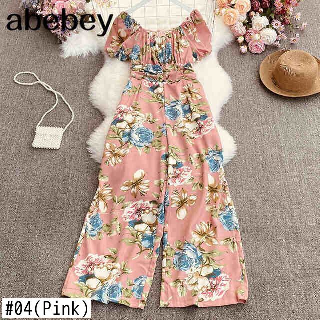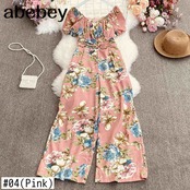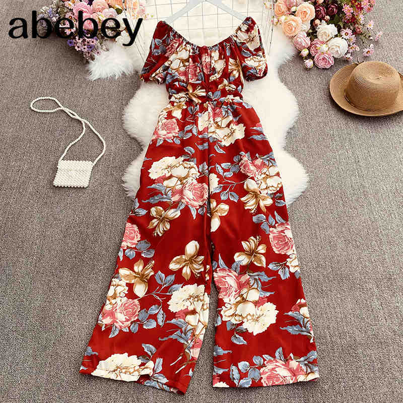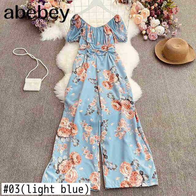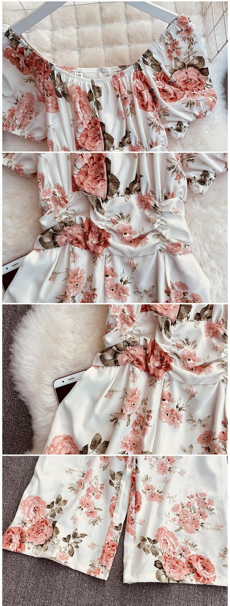 2022 夏の女性スラッシュネックオフショルダーパフスリーブジャンプスーツ弾性ウエストスリムプリントワイドレッグパンツジャンプスーツ エラスティック 伸縮 サマー 夏物 ワイドパンツ Abe29208671836