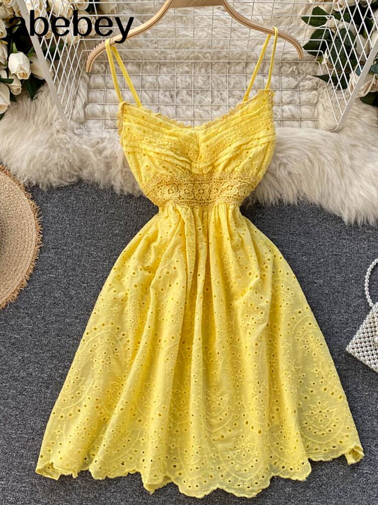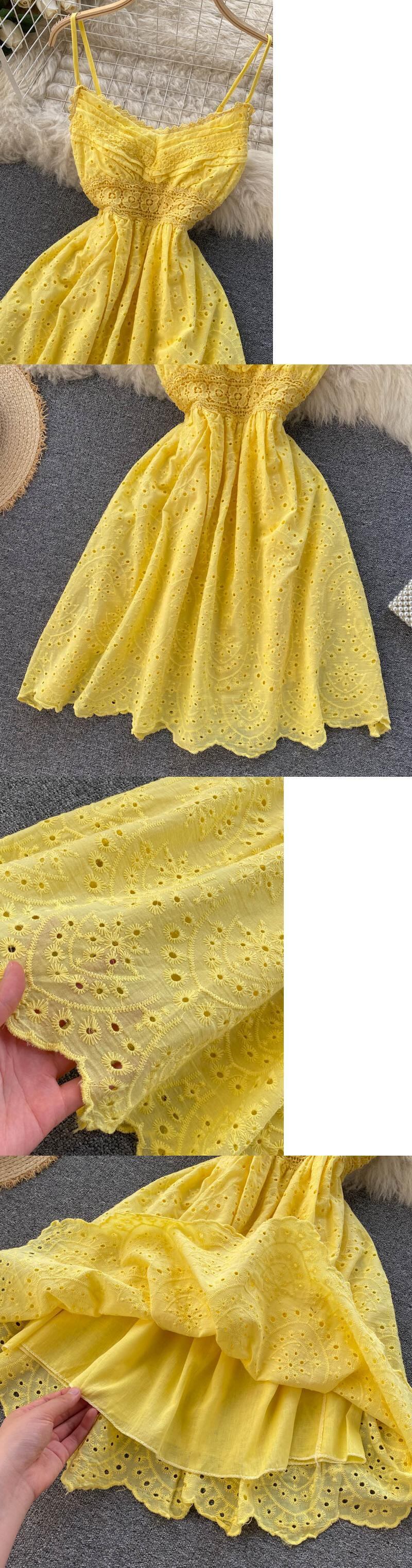 2022 夏スウィートストラップドレス中空アウト刺繍手を振って背中の開いた女性の休日のビーチドレスシックなドレス 大人ガーリー キュート カジュアル サマー 夏物 Abe58307154876
