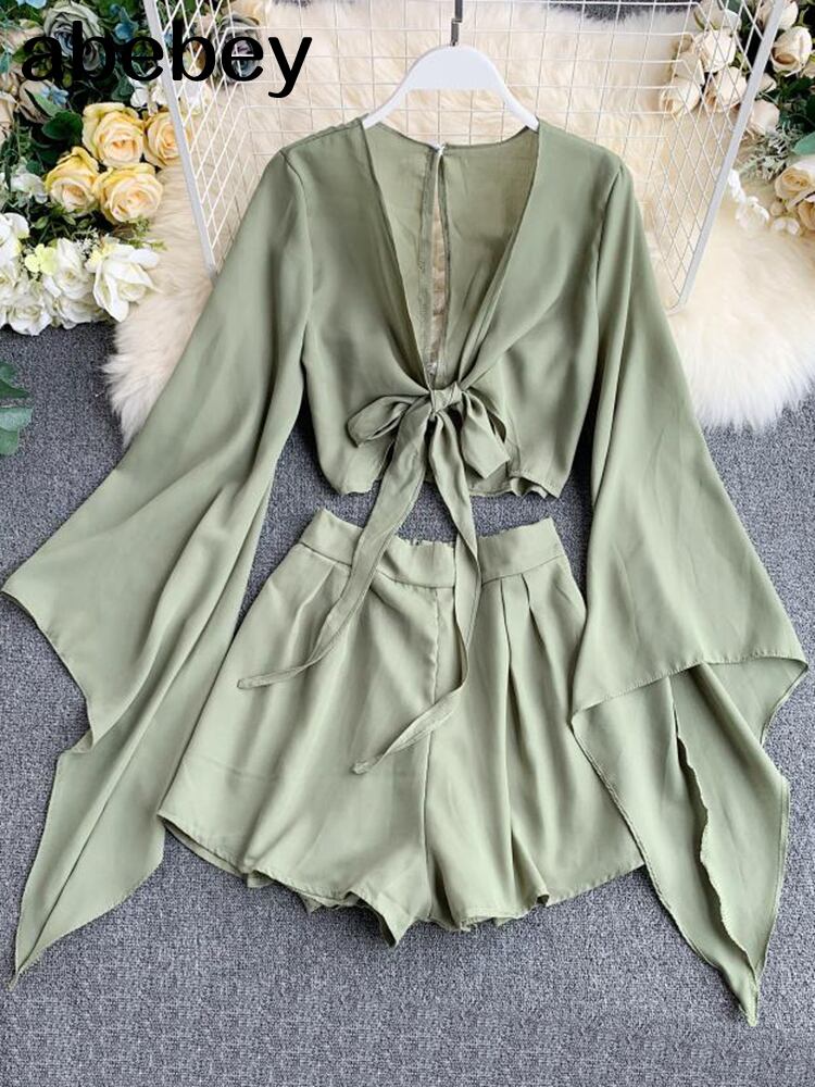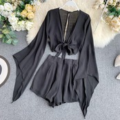 2022 夏 2 ピース衣装女性フレアスリーブクロップトップ + ブロードレッグショーツセクシーなソリッドシフォンスーツセット サマー 夏物 ブルマー ソリッドカラー Abe81885815266