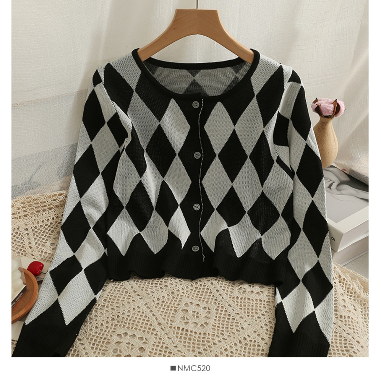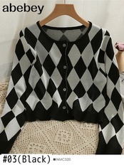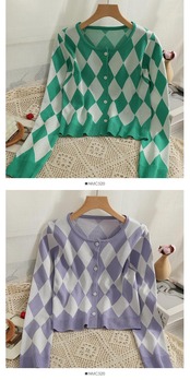 格子縞の女性のセーター秋ルーズショートニットセーター長袖ボタン O ネック無地ピンクカーディガントップ ロング オータム 秋物 Oネック ソリッドカラー Abe2903786832