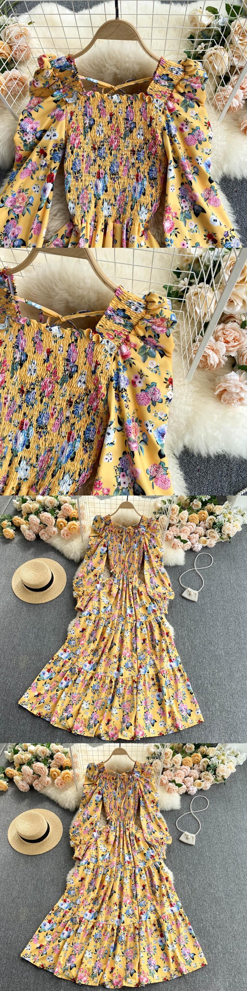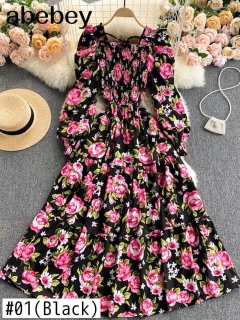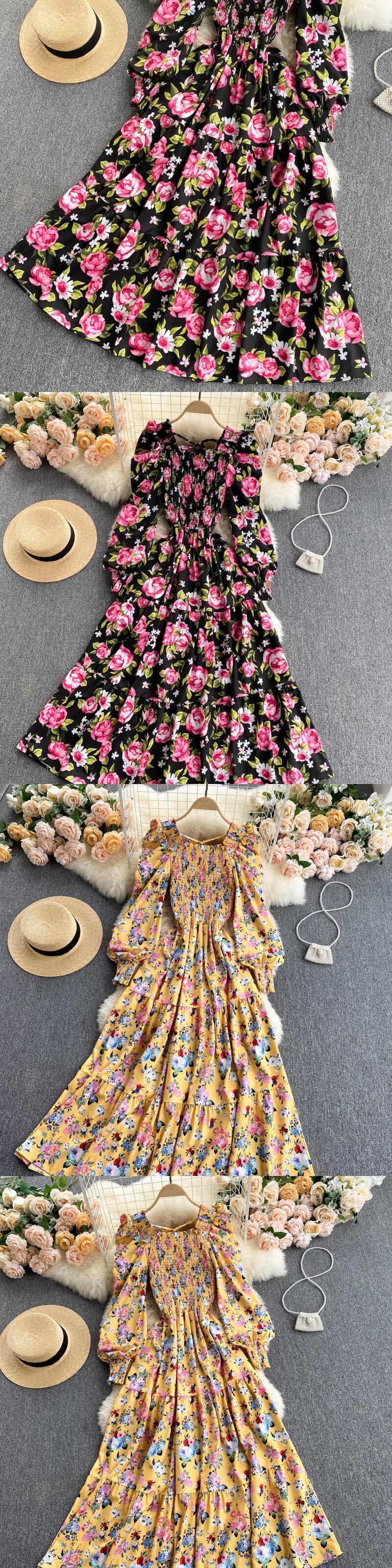 女性フレンチレトロ花柄ドレススクエアカラーパフスリーブAラインドレス春のシックなボヘミアンプリントロングドレス スプリング 春物 スクウェア Abe35324743779