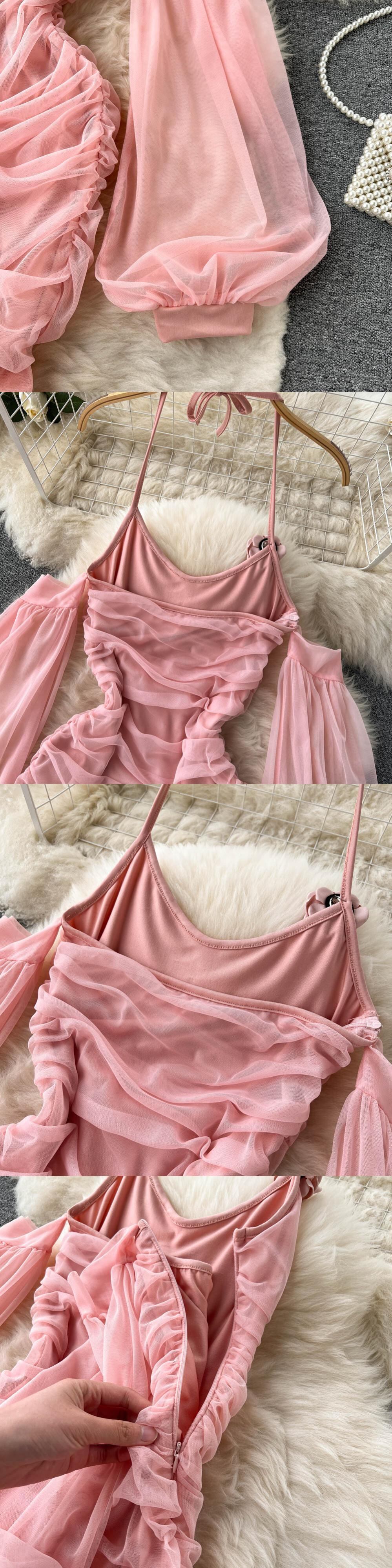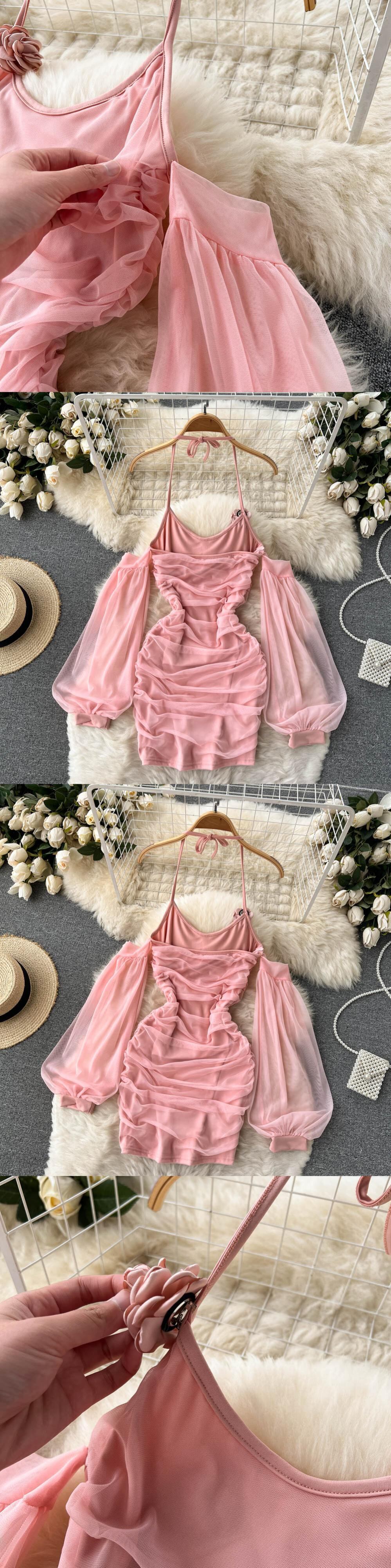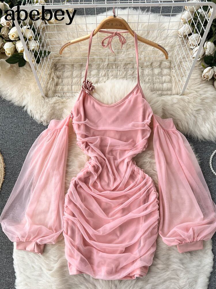 2022 ピンク女性スパゲッティストラップドレスオフショルダーシャーリングスリムドレス夏セクシーなボディコンクラブパーティーミニサンドレスビーチローブ サマー 夏物 Abe41311880271