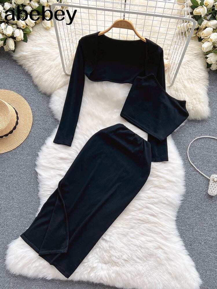 女性セット夏胸パッド V ネック長袖ショートブラウスストラップキャミソールスプリットロングスカートスリーピーススーツ サマー 夏物 Vネック Abe46381221712