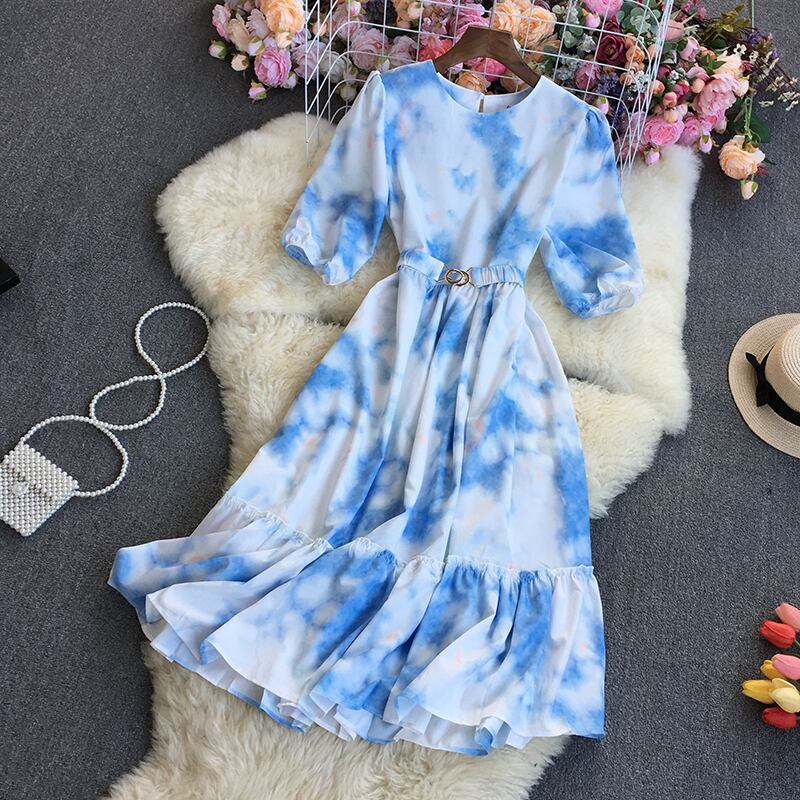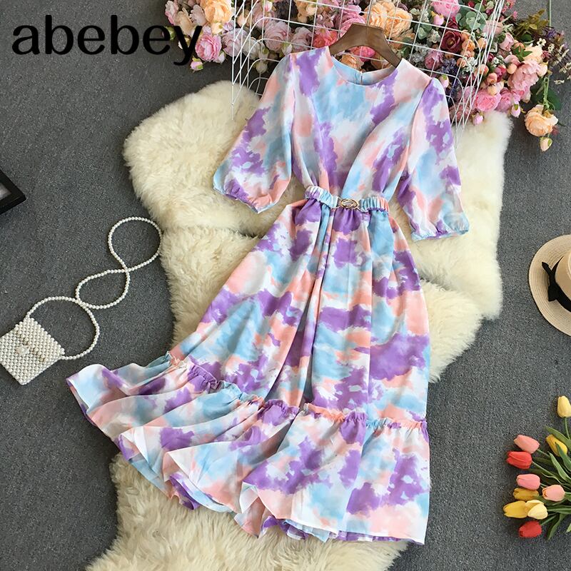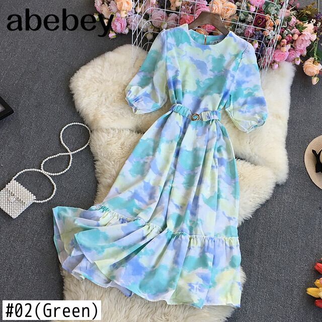 2022 春秋 O ネック半袖ドレスフリルパッチワークハイウエストプリーツタイダイプリントミドル丈ドレス ハイウェスト ショート ハーフスリーブ ラッフル スプリング 春物 オータム 秋物 Oネック Abe92217974263