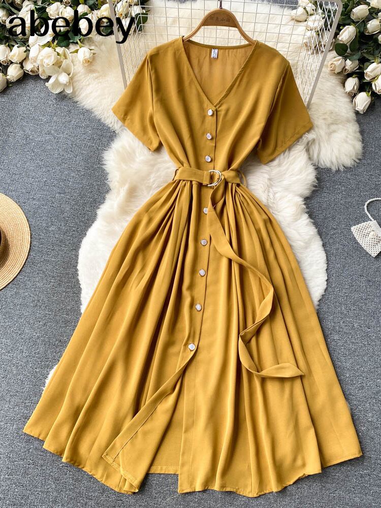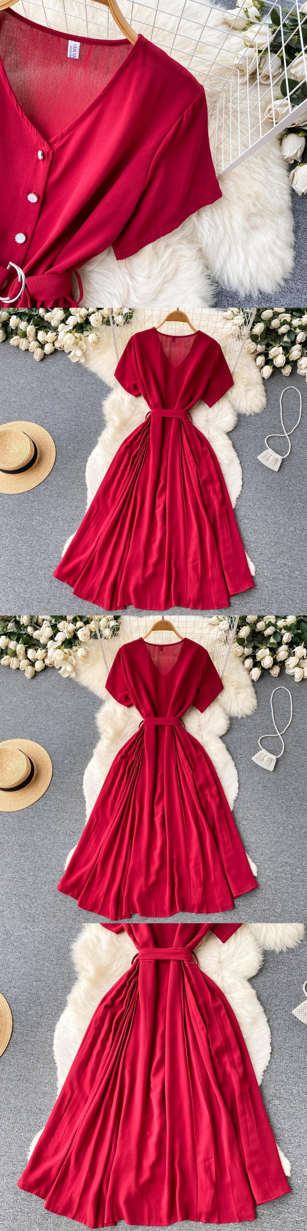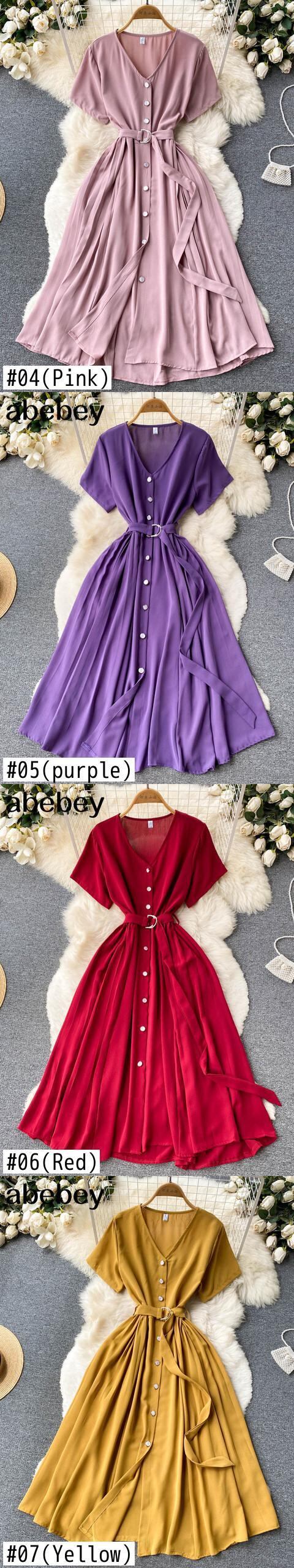 夏休みシフォンドレス女性 2022 プリーツロングドレス無地気質 V ネックマキシボヘミアドレスローブ サマー 夏物 Vネック ソリッドカラー Abe79132772650