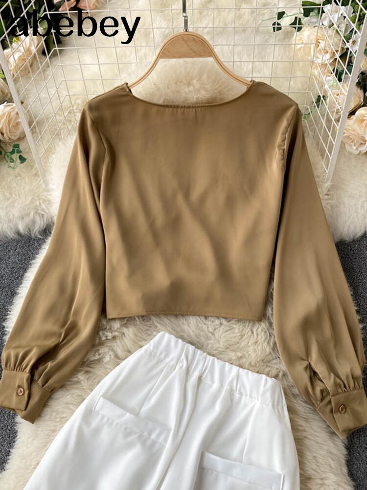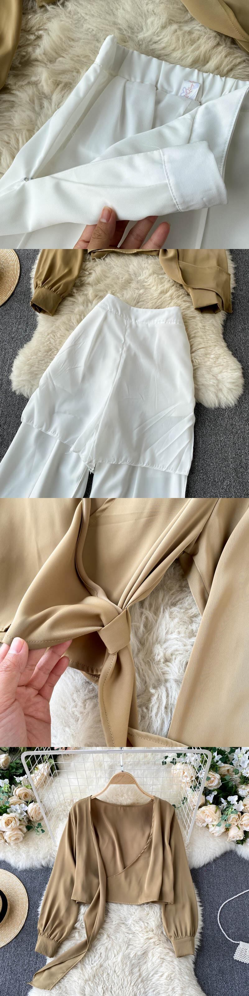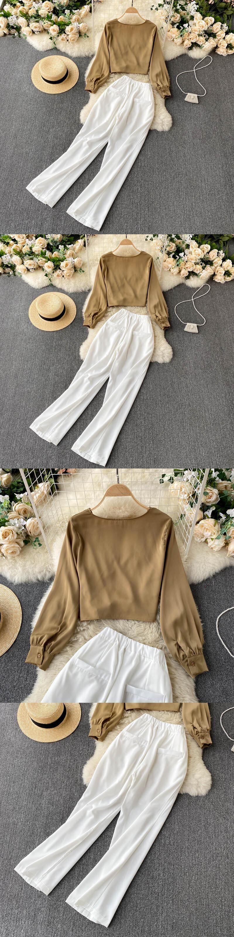 レディースサマーVネックロングスリーブブラウス+ウエストロングパンツツーピースセット 長袖 夏物 Abe68143164265